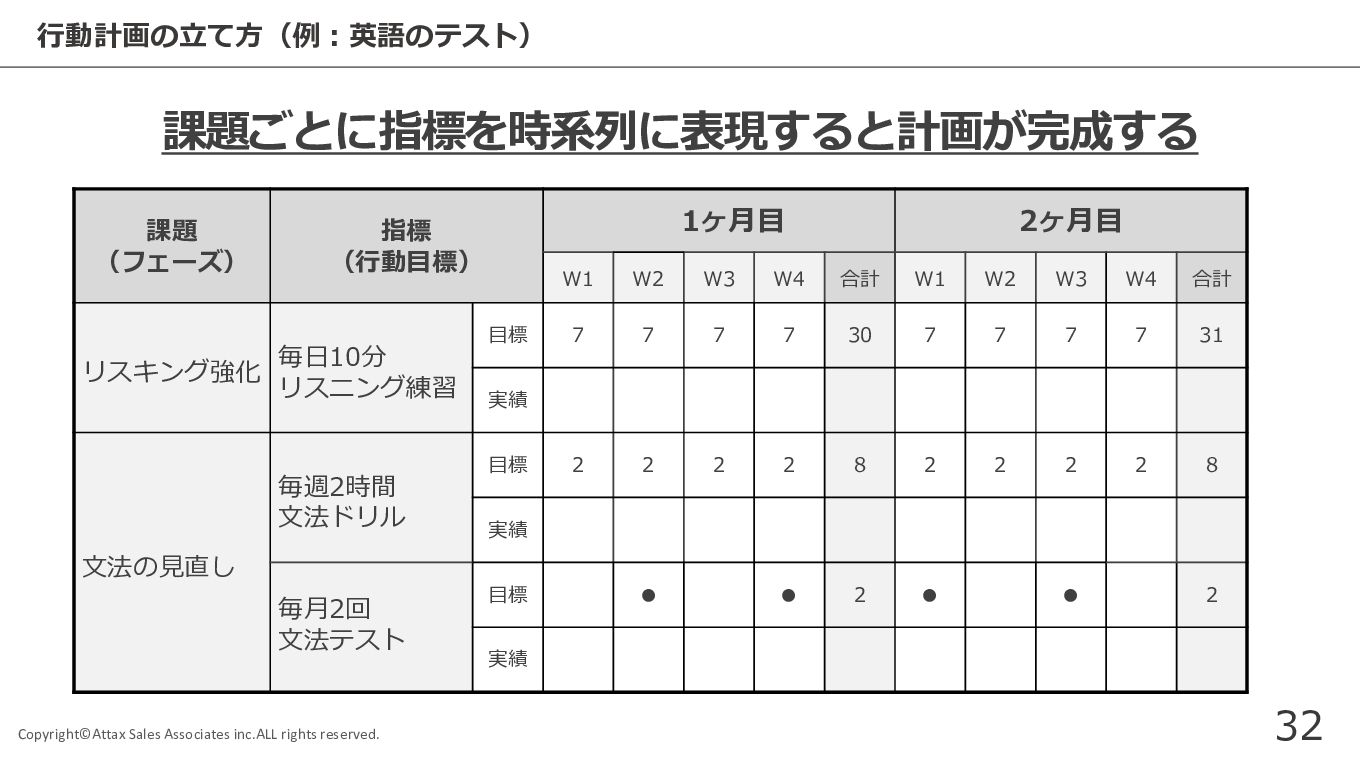 ⾏動計画の⽴て⽅(例︓英語のテスト) Copyright©Attax Sales Associates inc.ALL rights reserved. 32 2ヶ⽉目 1ヶ⽉目