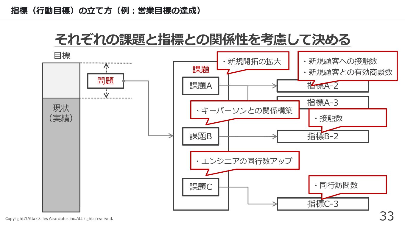 課題 指標(⾏動目標)の⽴て⽅(例︓営業目標の達成) Copyright©Attax Sales Associates inc.ALL rights reserved. 33 問題