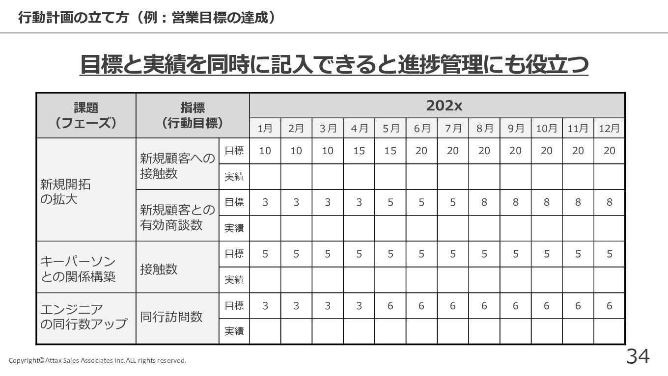 ⾏動計画の⽴て⽅(例︓営業目標の達成) Copyright©Attax Sales Associates inc.ALL rights reserved. 34 202x 指標