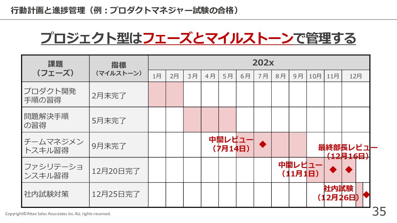 ⾏動計画と進捗管理(例︓プロダクトマネジャー試験の合格) Copyright©Attax Sales Associates inc.ALL rights reserved. 35 202x 指標