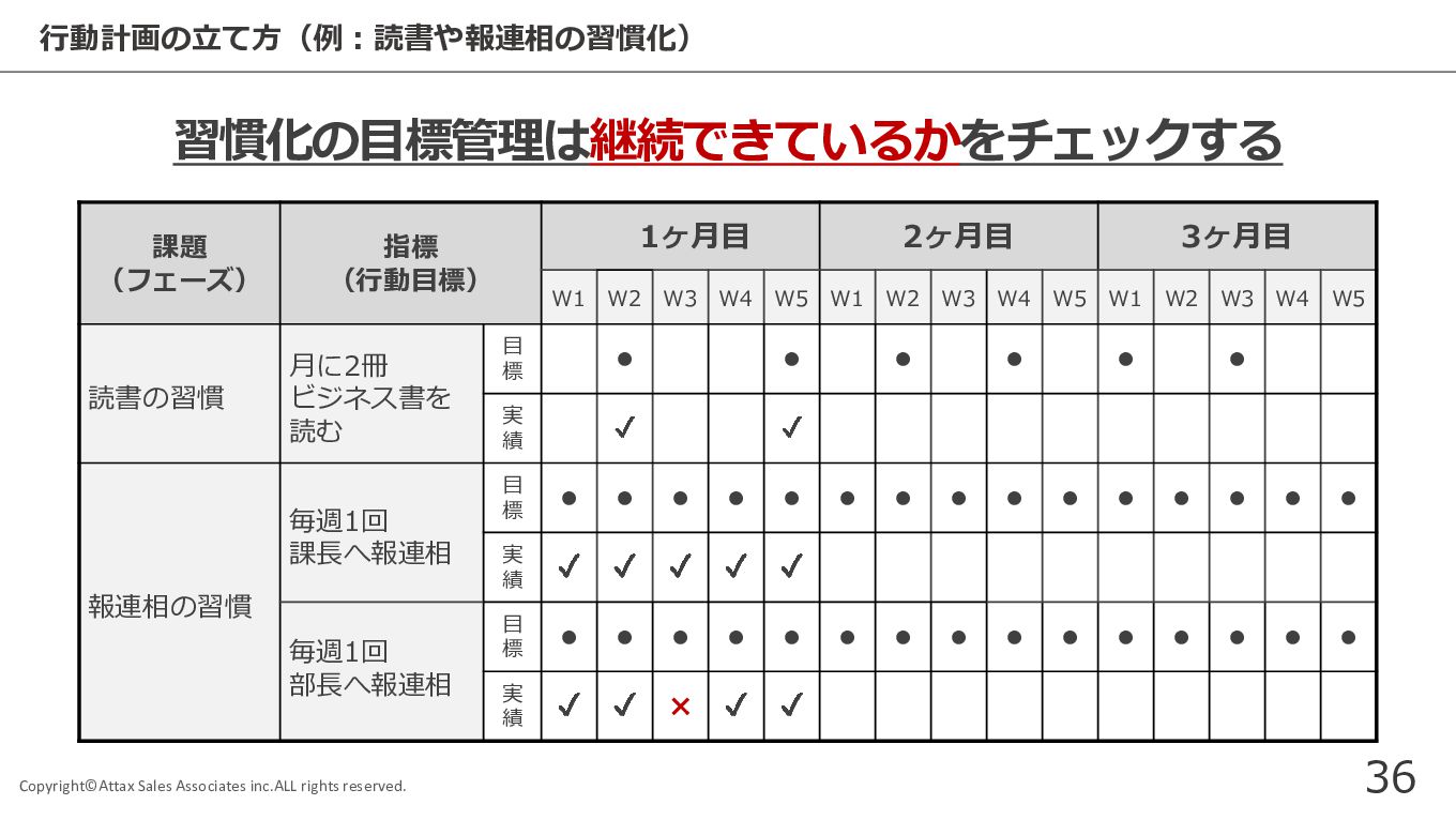 ⾏動計画の⽴て⽅(例︓読書や報連相の習慣化) Copyright©Attax Sales Associates inc.ALL rights reserved. 36 3ヶ⽉目 2ヶ⽉目