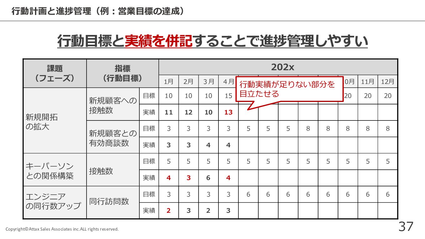 ⾏動計画と進捗管理(例︓営業目標の達成) Copyright©Attax Sales Associates inc.ALL rights reserved. 37 202x 指標