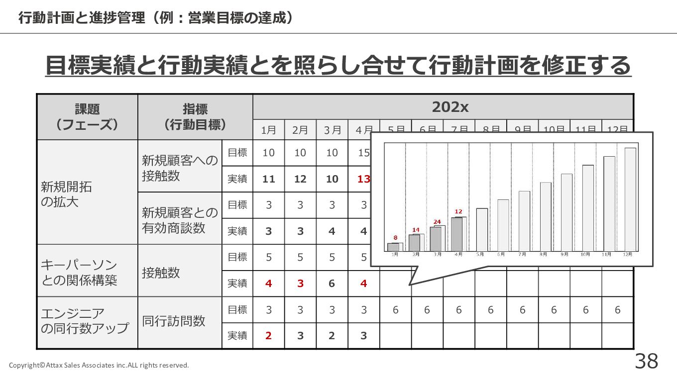 ⾏動計画と進捗管理(例︓営業目標の達成) Copyright©Attax Sales Associates inc.ALL rights reserved. 38 202x 指標