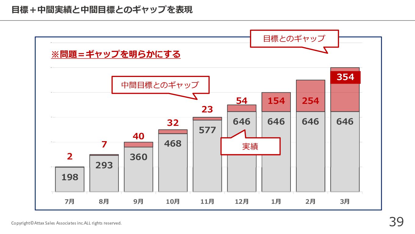 Copyright©Attax Sales Associates inc.ALL rights reserved. 39 目標+中間実績と中間目標とのギャップを表現 198 293