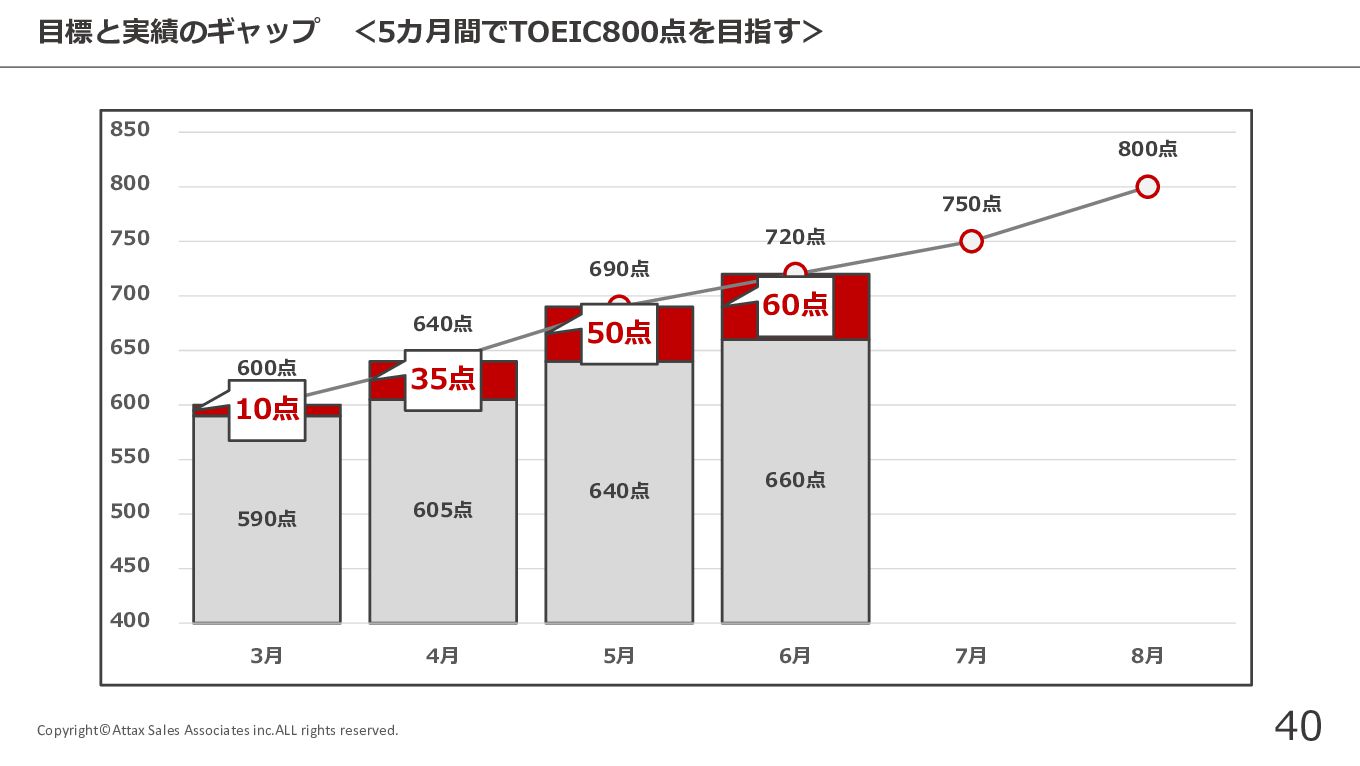 Copyright©Attax Sales Associates inc.ALL rights reserved. 40 目標と実績のギャップ <5カ⽉間でTOEIC800点を目指す> 590点