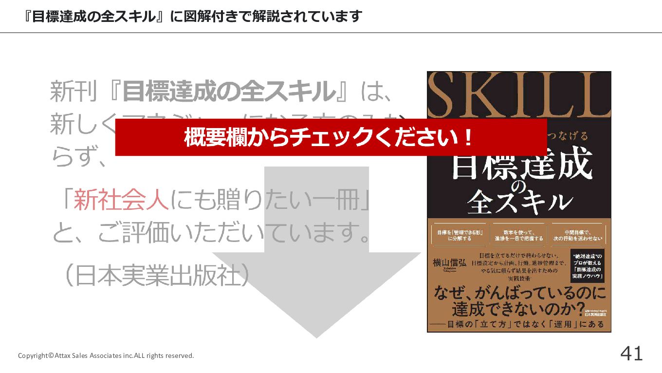 Copyright©Attax Sales Associates inc.ALL rights reserved. 41 『目標達成の全スキル』に図解付きで解説されています