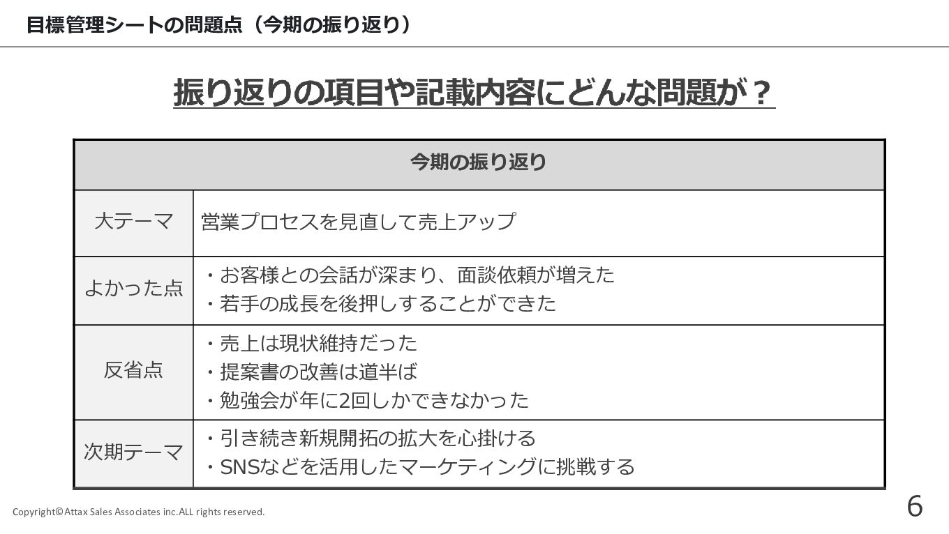 目標管理シートの問題点(今期の目標) Copyright©Attax Sales Associates inc.ALL rights reserved. 5 今期の目標 営業プロセスを⾒直して売上アップ
