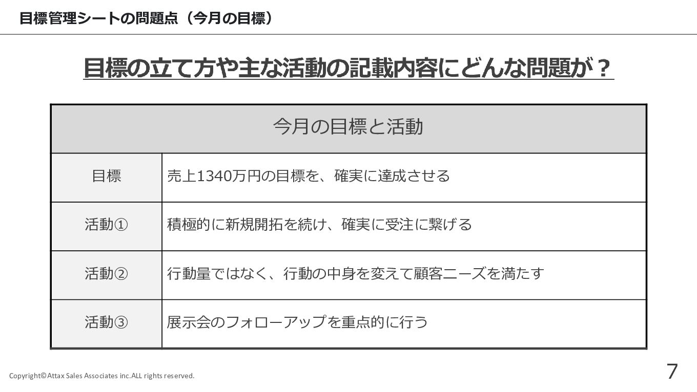 目標管理シートの問題点(今⽉の目標) Copyright©Attax Sales Associates inc.ALL rights reserved. 7 今月の目標と活動 売上1340万円の目標を、確実に達成させる