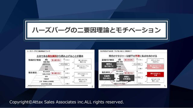 同僚との関係 動機付け要因 衛生要因 Copyright©Attax Sales Associates inc.ALL rights reserved. 4 なぜ昔はやる気を「上げる努⼒」が重要だったか︖ 大きい 小さい インパクト インパクト 大きい 小さい 昭和の時代のマネジャーは部下の満足に焦点を合わせた 個人差小さい 満たされると 満足する 満たされなくても 不満はない 満たされないと 不満 満たされても 満足しない 個人差大きい 犠牲にしても いい︕ 水を飲むな︕ アイス 欲しいだろ︕