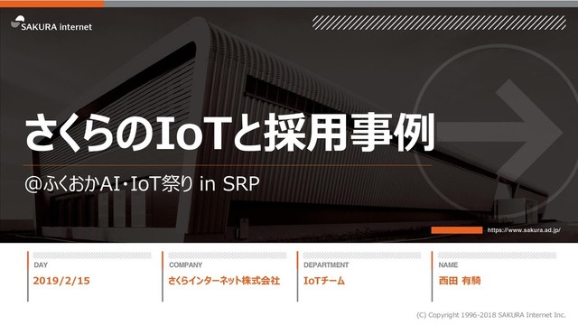 2019年2月15日に開催された「第3回 ふくおかAI・IoT祭り in SRP」での登壇内容です。さくらインターネットで提供しているIoTに関連するサービスの紹介と、実際に利用されている事例をご紹介します。