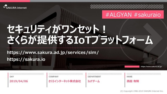 IoT ALGYAN 4周年 IoT祭り2019 ( https://algyan.connpass.com/event/122064/ ) で登壇させていただいた内容です。 個人での検証段階から商用利用に進むためにはセキュリティの検討が不可欠です。本スライドでは、さくらインターネットが提供するIoTプラットフォームに標準で組み込まれているセキュリティを中心に解説します。