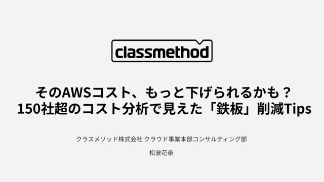 クラスメソッド株式会社 クラウド事業本部コンサルティング部 松波花奈 そのAWSコスト、もっと下げられるかも? 150社超のコスト分析で⾒えた「鉄板」削減Tips