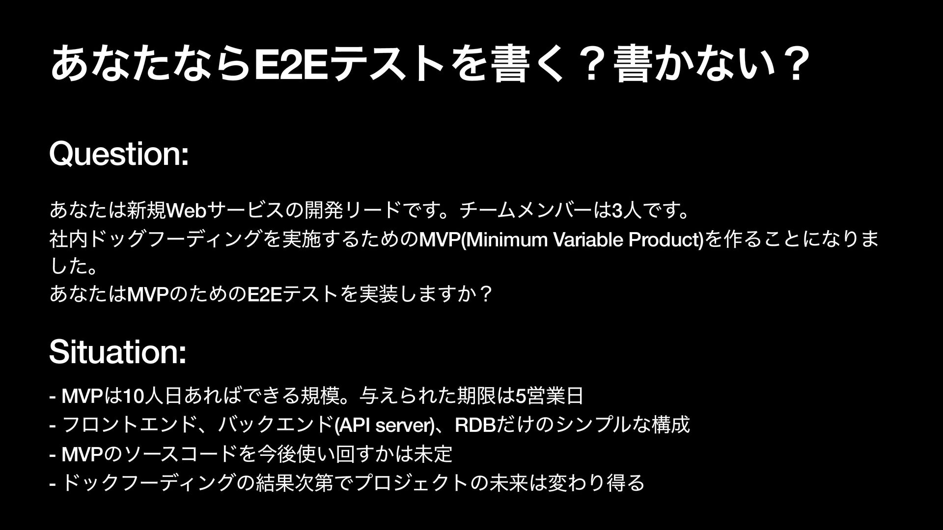 Question: ͋ͳͨ৽نWebαʔϏεͷ։ൃϦʔυͰ͢ɻνʔϜϝϯόʔ3ਓͰ͢ɻ ࣾυοάϑʔσΟϯάΛ࣮ࢪ͢ΔͨΊͷMVP(Minimum Variable Product)Λ࡞Δ͜ͱʹͳΓ· ͨ͠ɻ ͋ͳͨMVPͷͨΊͷE2EςετΛ࣮͠·͔͢ʁ Situation: - MVP10ਓ͋ΕͰ͖Δنɻ༩͑ΒΕͨظݶ5Ӧۀ