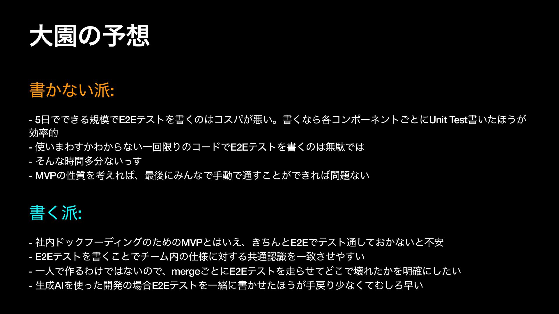 MVPͷੑ࣭Λߟ͑Εɺ࠷ޙʹΈΜͳͰखಈͰ௨͢͜ͱ͕Ͱ͖Εͳ͍ ॻ͘: - ࣾυοΫϑʔσΟϯάͷͨΊͷMVPͱ͍͑ɺ͖ͪΜͱE2EͰςετ௨͓͔ͯ͠ͳ͍ͱෆ҆ - E2EςετΛॻ͘͜ͱͰνʔϜͷ༷ʹର͢Δڞ௨ೝࣝΛҰக͍ͤ͢͞ - ҰਓͰ࡞ΔΘ͚Ͱͳ͍ͷͰɺmerge͝ͱʹE2EςετΛΒͤͯͲ͜ͰյΕ͔ͨΛ໌֬ʹ͍ͨ͠ - ੜAIΛͬͨ։ൃͷ߹E2EςετΛҰॹʹॻ͔ͤͨ΄͏͕खΓগͳͯ͘Ή͠Ζૣ͍ େԂͷ༧