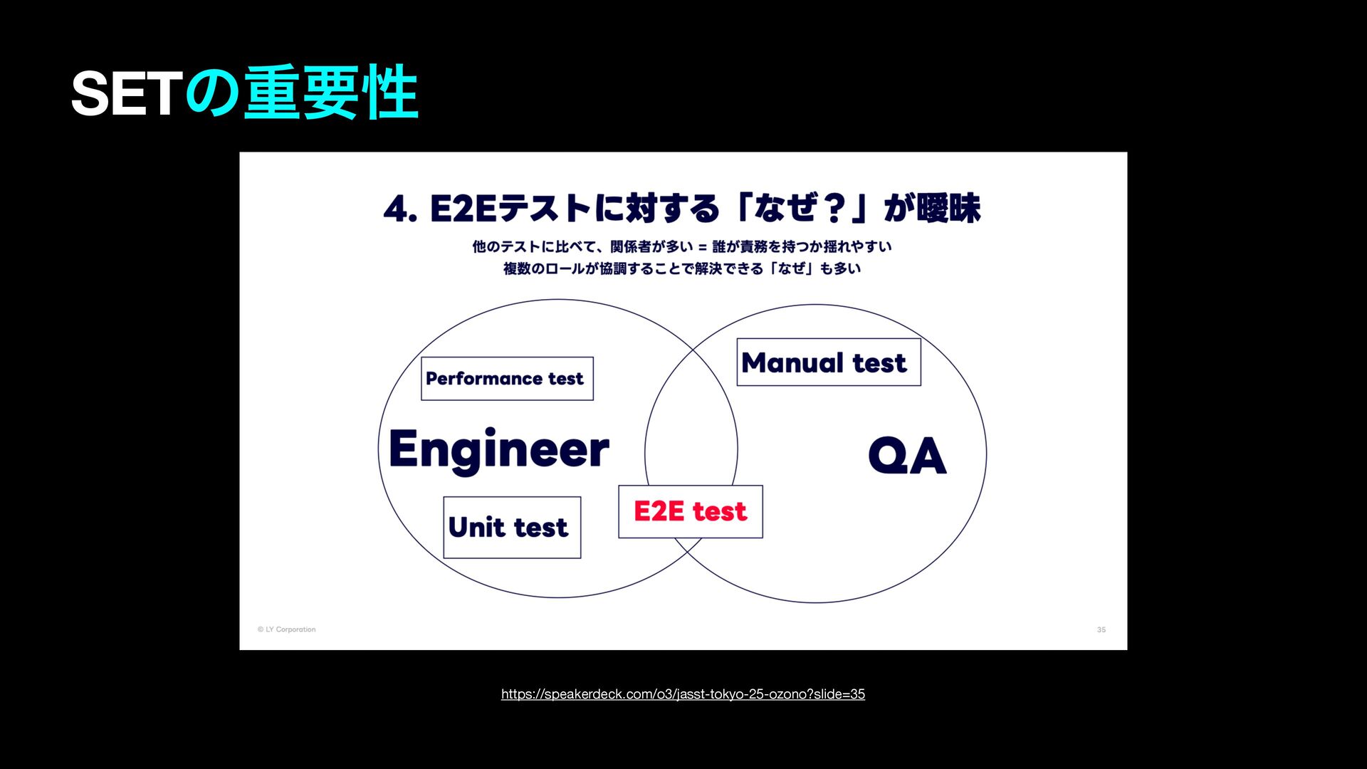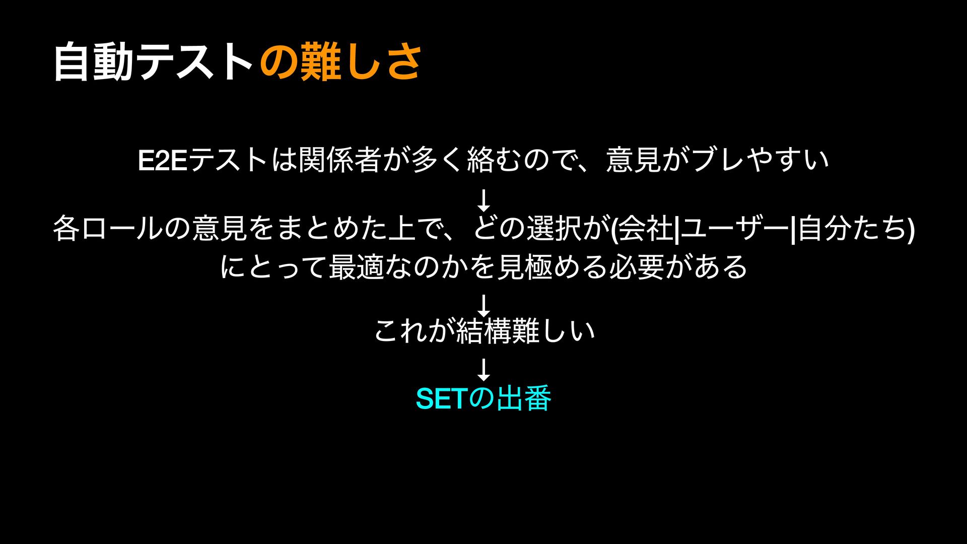 E2Eςετؔऀ͕ଟ͘བྷΉͷͰɺҙݟ͕ϒϨ͍͢ ↓ ֤ϩʔϧͷҙݟΛ·ͱΊ্ͨͰɺͲͷબ͕(ձࣾ|Ϣʔβʔ|ࣗͨͪ) ʹͱͬͯ࠷దͳͷ͔ΛݟۃΊΔඞཁ͕͋Δ ↓ ͜Ε͕݁ߏ͍͠ ↓ SETͷग़൪ ࣗಈςετͷ͠͞