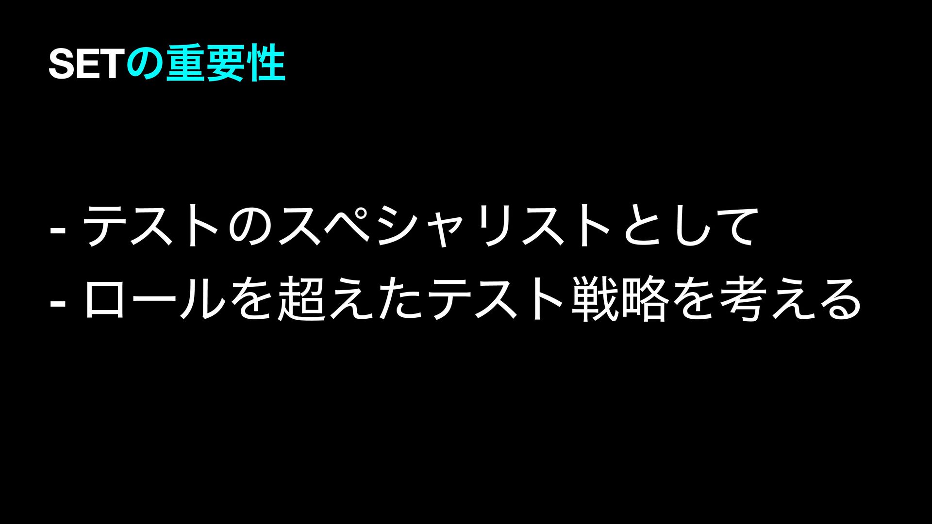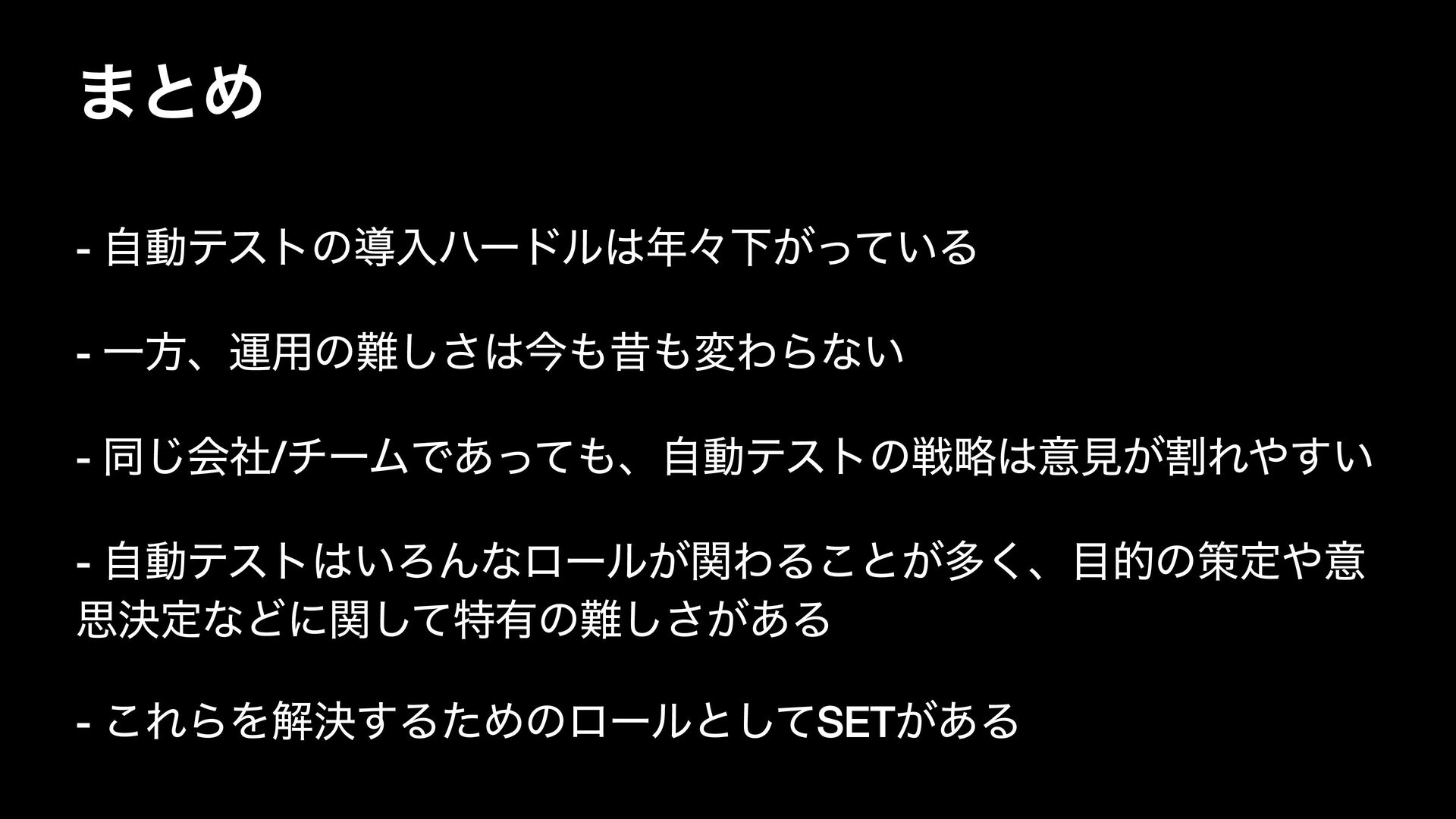 ͳͥࣗಈςετΛ͢Δͷ͔ͱ͍͏తΛݟࣦΘͳ͍ - ςετͱ͍͏χονͳͰͷٕज़తͳߩݙ - ٯʹɺ্هͷΑ͏ͳ՝͕ͳ͍߹SETඞཁͳ͍͔͠Εͳ͍ (͜ͷลΓձࣾͷنɺνʔϜͷੑ࣭ʹΑΔ) େԂ͕େࣄʹ͍ͯ͠ΔɺSETͷॏཁੑ