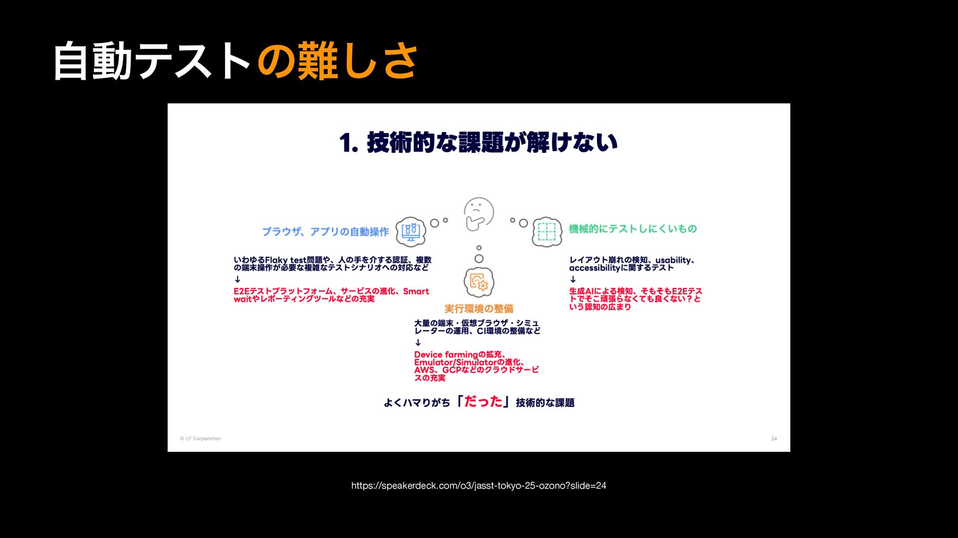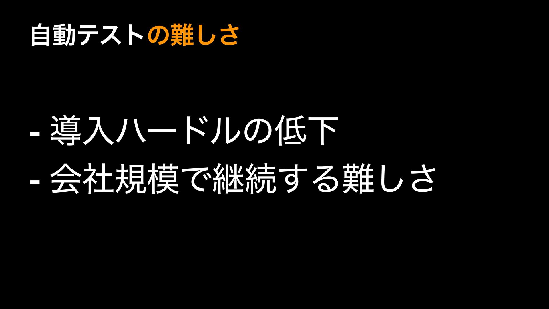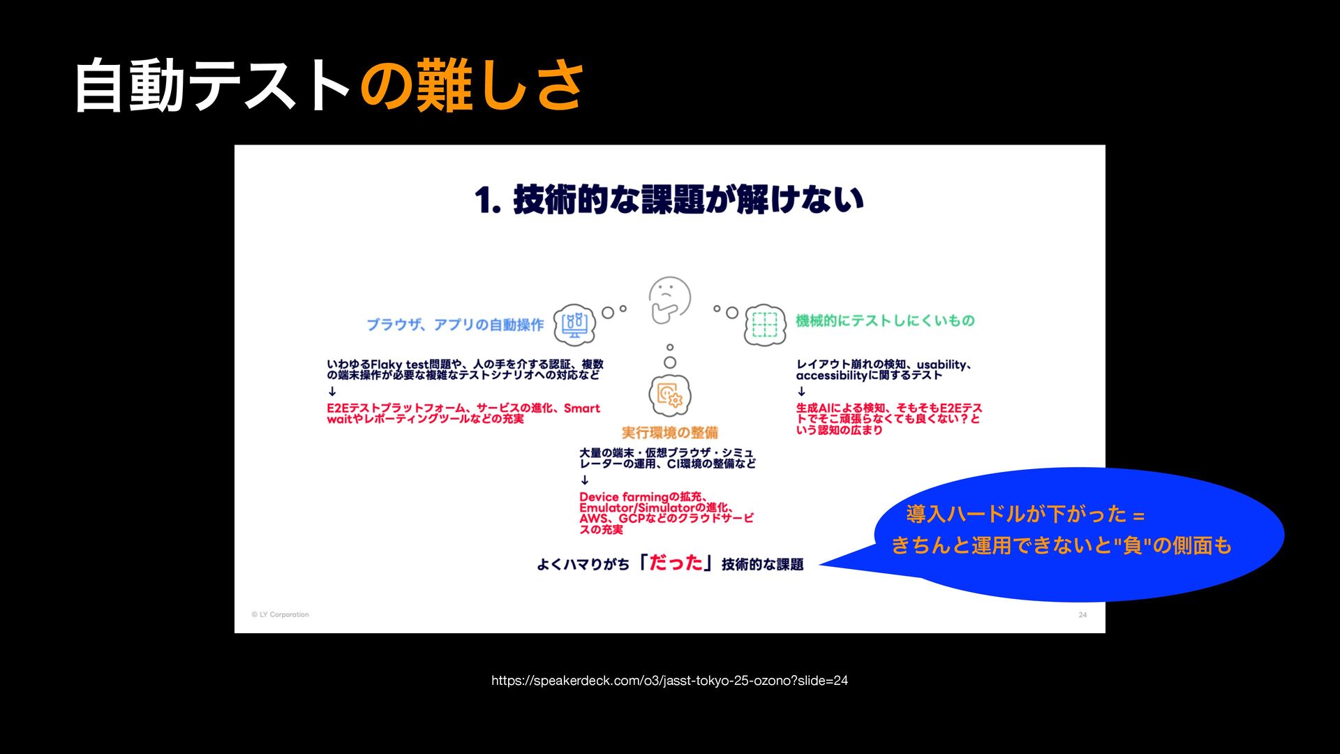 - ࣗಈςετͷಋೖϋʔυϧʑԼ͕͍ͬͯΔ - Ұํɺӡ༻ͷ͠͞ࠓੲมΘΒͳ͍ - ಉ͡ձࣾ/νʔϜͰ͋ͬͯɺࣗಈςετͷઓུҙݟׂ͕Ε͍͢