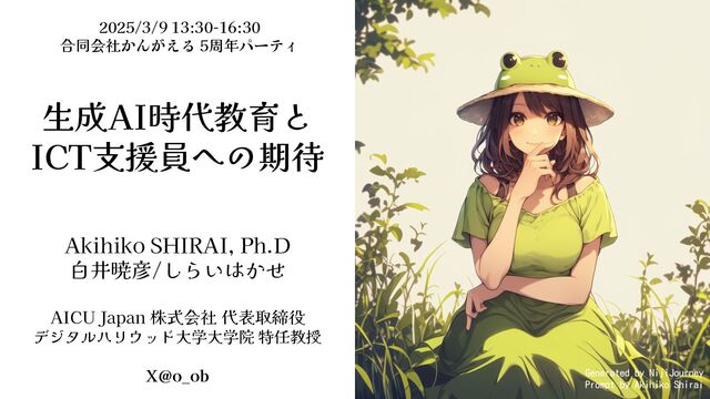 in Ad Agency [Dentsu] ▪The true value of AI is not cheap or fast, but "making the impossible possible" Dentsu News 2024/10/04 https://dentsu-ho.com/articles/9068 AIの真価は安い‧速いではなく「不可能を可能にする」こと 電通報 2024/10/04 斧 涼之介 株式会社 電通‧⽩井 暁彦 AICU Inc. ▪Workshop and hackathon using cloud GPU for 175 Dentsu employees at the same time! ▼Art-photo by AICU Creative ▼Textbook [Stable Diffusion Start Guide」(published by Softbank Creative)