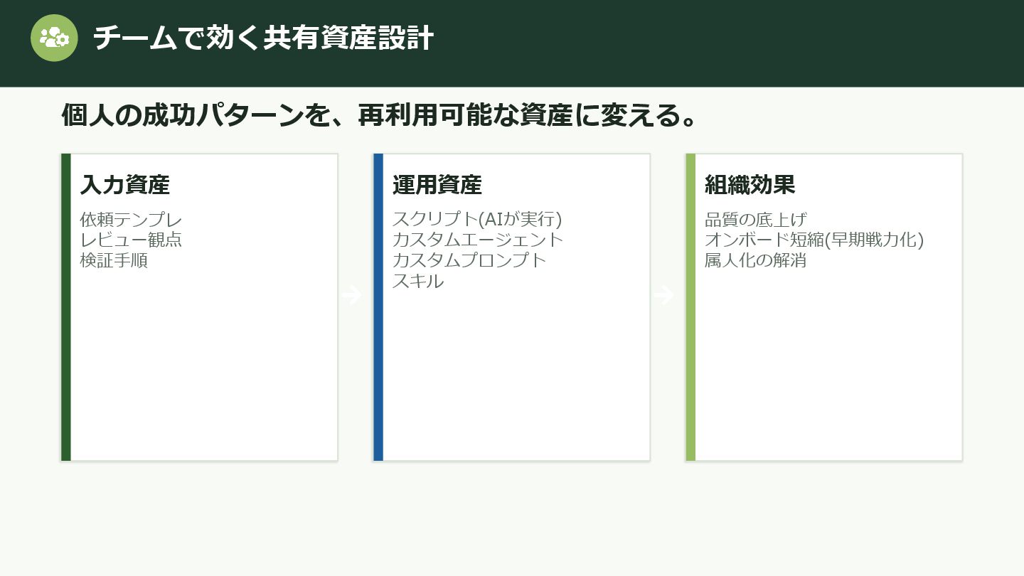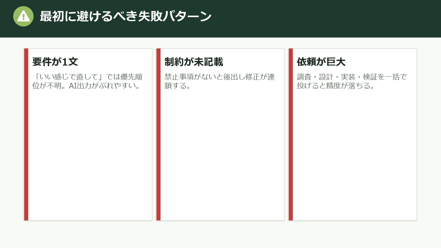 3. 実装 本文/コード生成 形式を統一 4. レビュー 抜け漏れ 要件充足を検証 分割すると「どこで品質が落ちたか」を切り分けやすい。