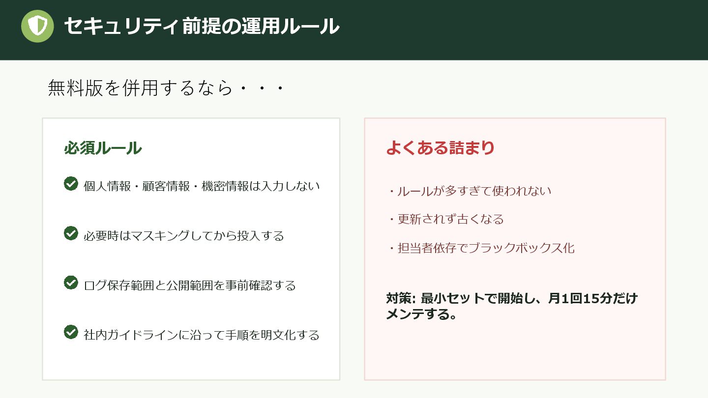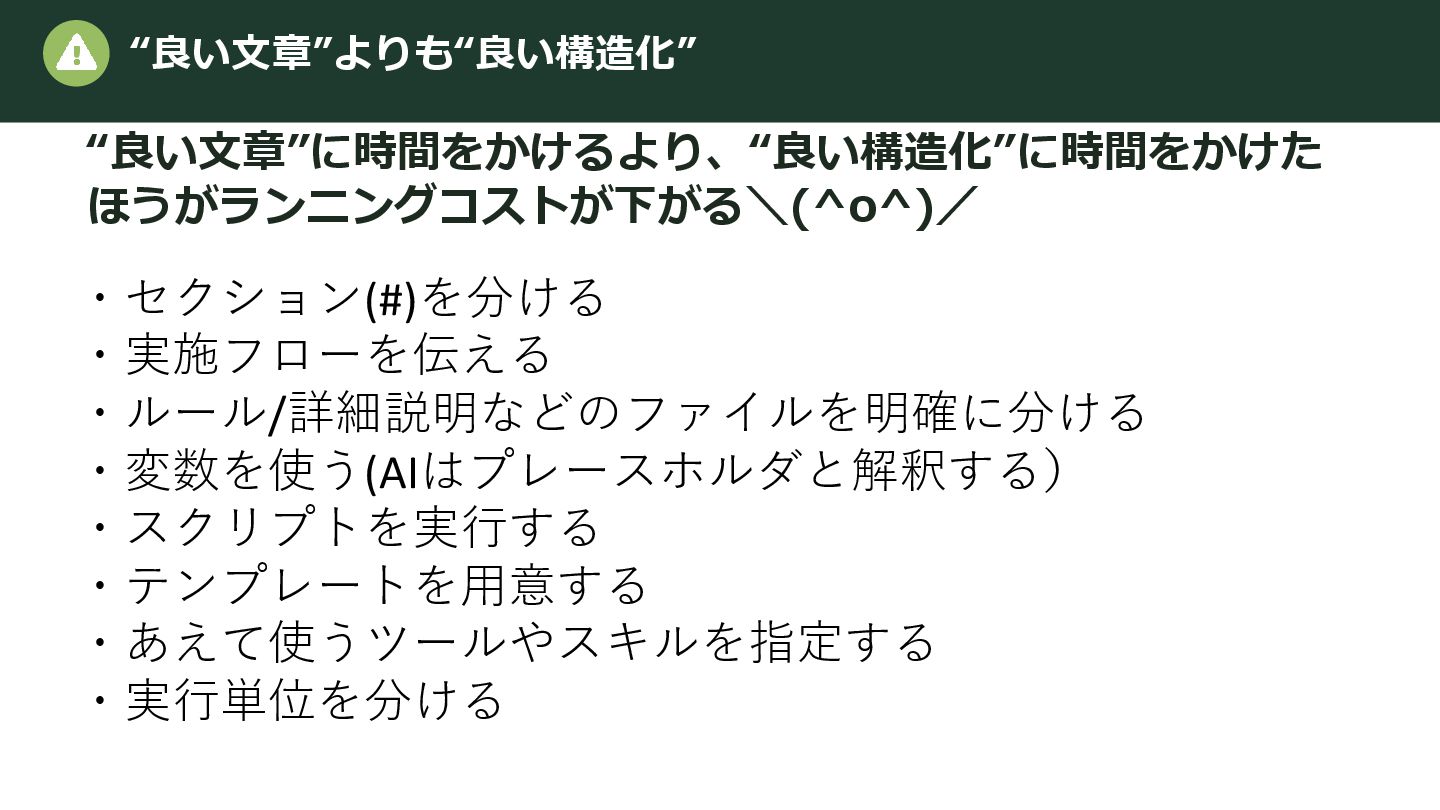 使用環境 # 制約 - 使ってよい技術 / 禁止事項 - 納期・優先順位 # 期待する出力 - 形式(Markdown / JSON / コード) - 完了条件 自由記述より構造化。これだけで初回品質は安定する。