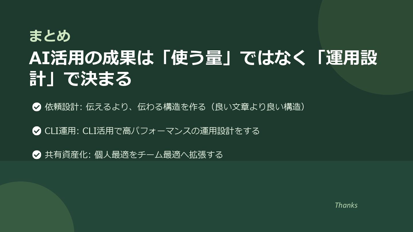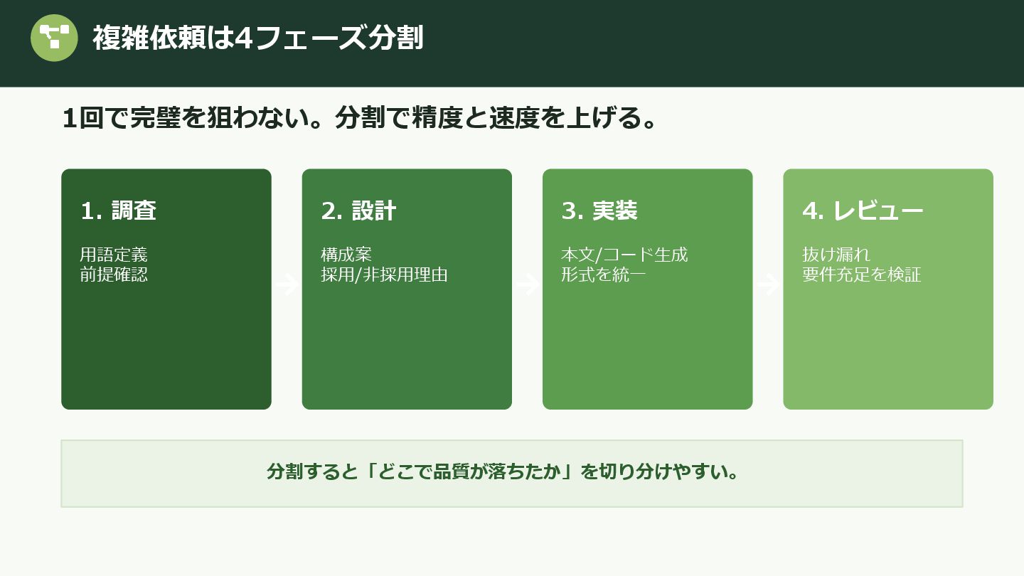 2. 複雑依頼は4フェーズ分割 1回で完璧を狙わない。分割で精度と速度を上げる。 1. 調査 用語定義 前提確認 2. 設計 構成案 採用/非採用理由