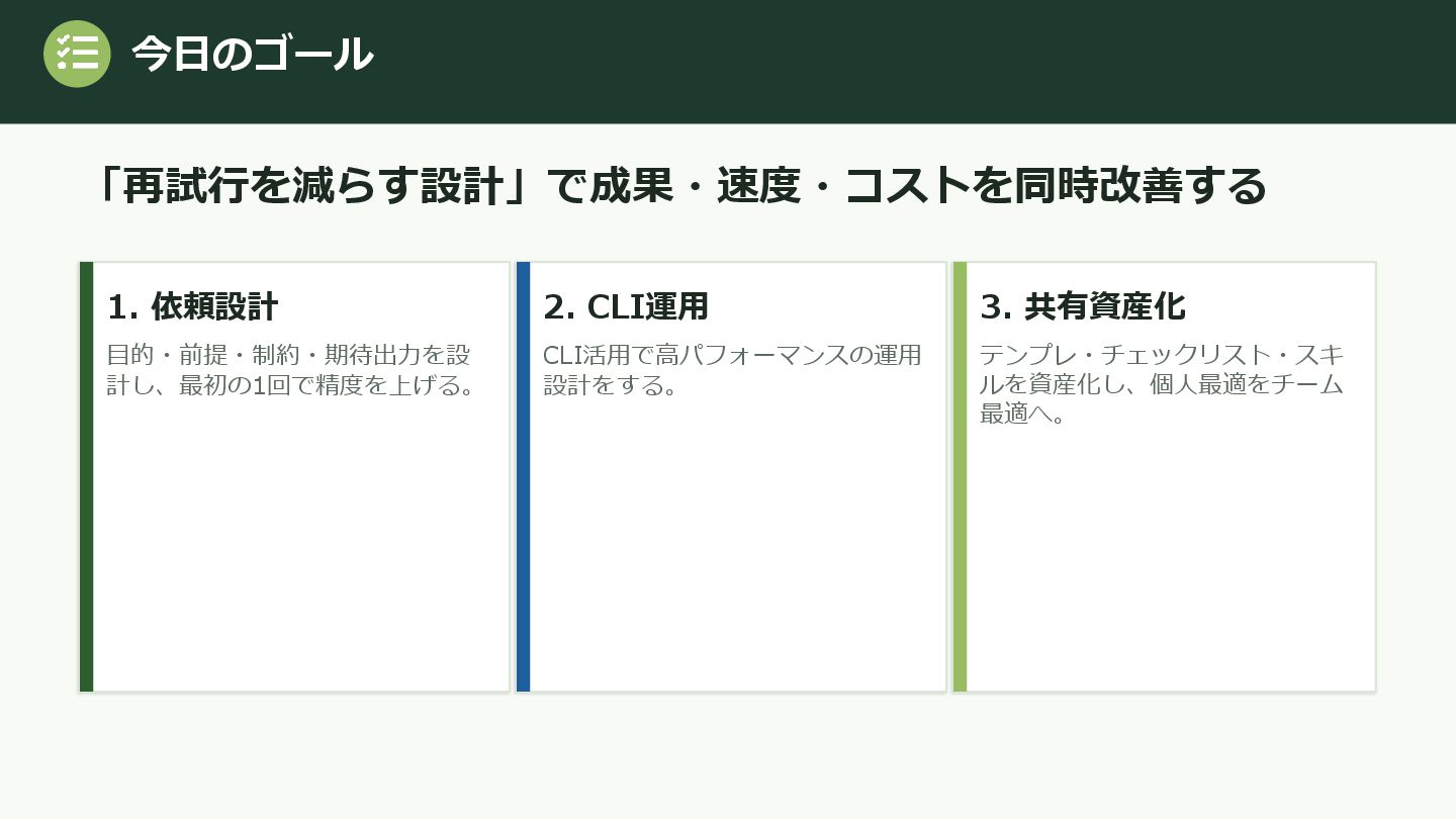 生成AIは非常に便利ですが、実務では「無限に使える道具」ではありません。トークン制限やリクエスト制限がある環境では、1回のやり取りでどれだけ意図を正確に伝えられるかが、そのまま成果と速度に直結します。つまり、AI活用の本質は「たくさん質問すること」ではなく、「再試行を減らす設計」にあります。