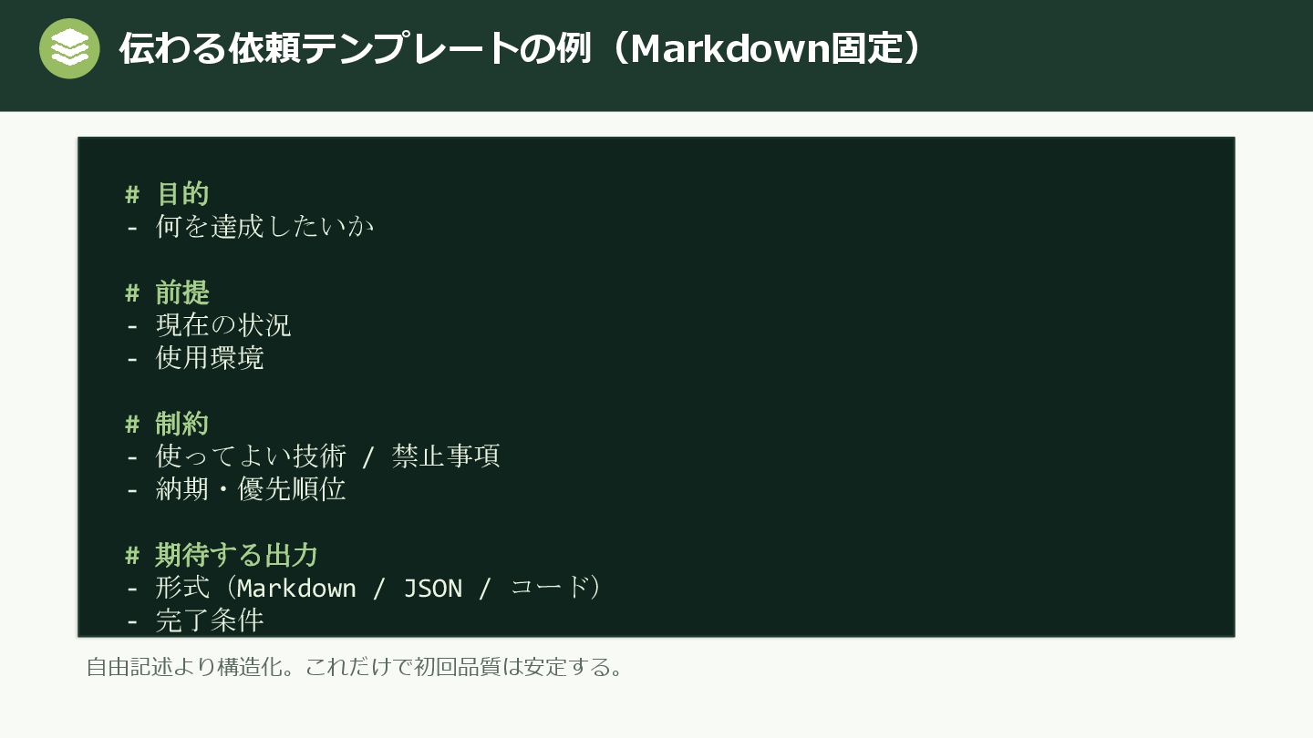 1. 伝わる依頼テンプレートの例(Markdown固定) # 目的 - 何を達成したいか # 前提 - 現在の状況 -