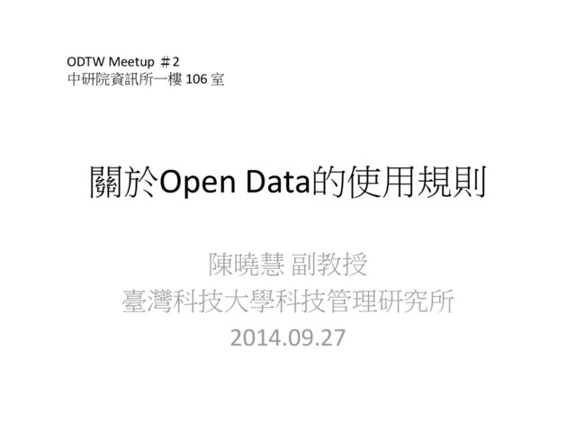 We want the information on this site to be open and as easy to re-use as possible. – When you submit information to this site we will work on the basis, unless you clearly state otherwise alongside your work, that you are granting the Crown a non-exclusive, irrevocable right to use and pass on all public information that you submit (for example descriptions of your ideas and screenshots of your apps) as well as the right to allow the re-use of that information. – This is so that we can place the contents of this site under the same permissive licence terms as above. Your ideas and applications remain your own. • The accuracy of information from any third party sites published on data.gov.uk is the responsibility of those sites. 2014/9/27 開放資料使用規則.陳曉慧.NTUST 15