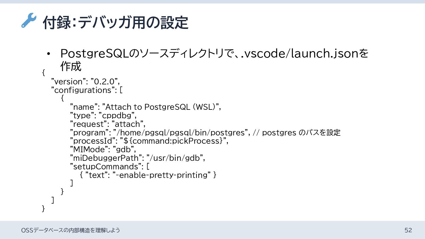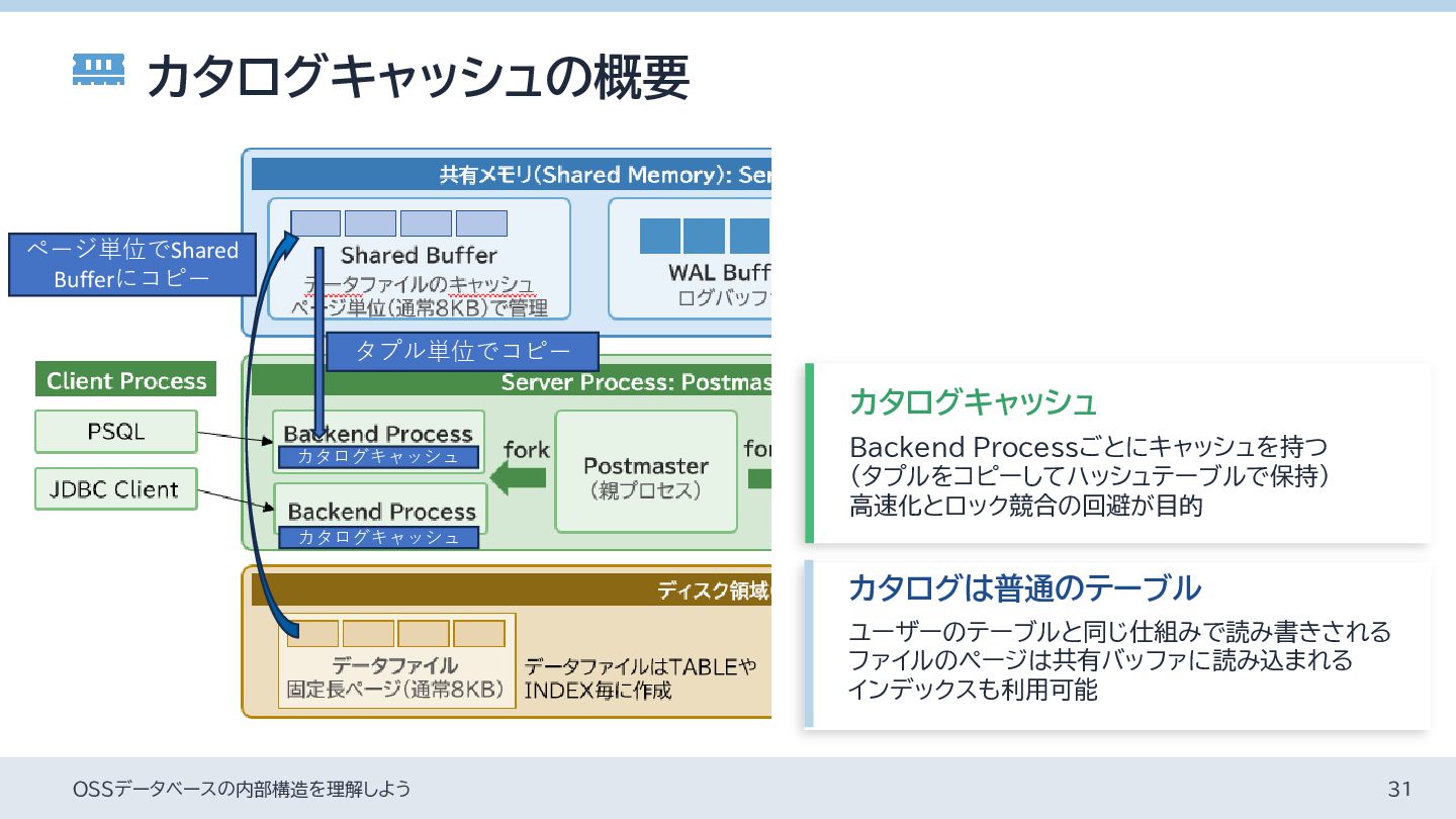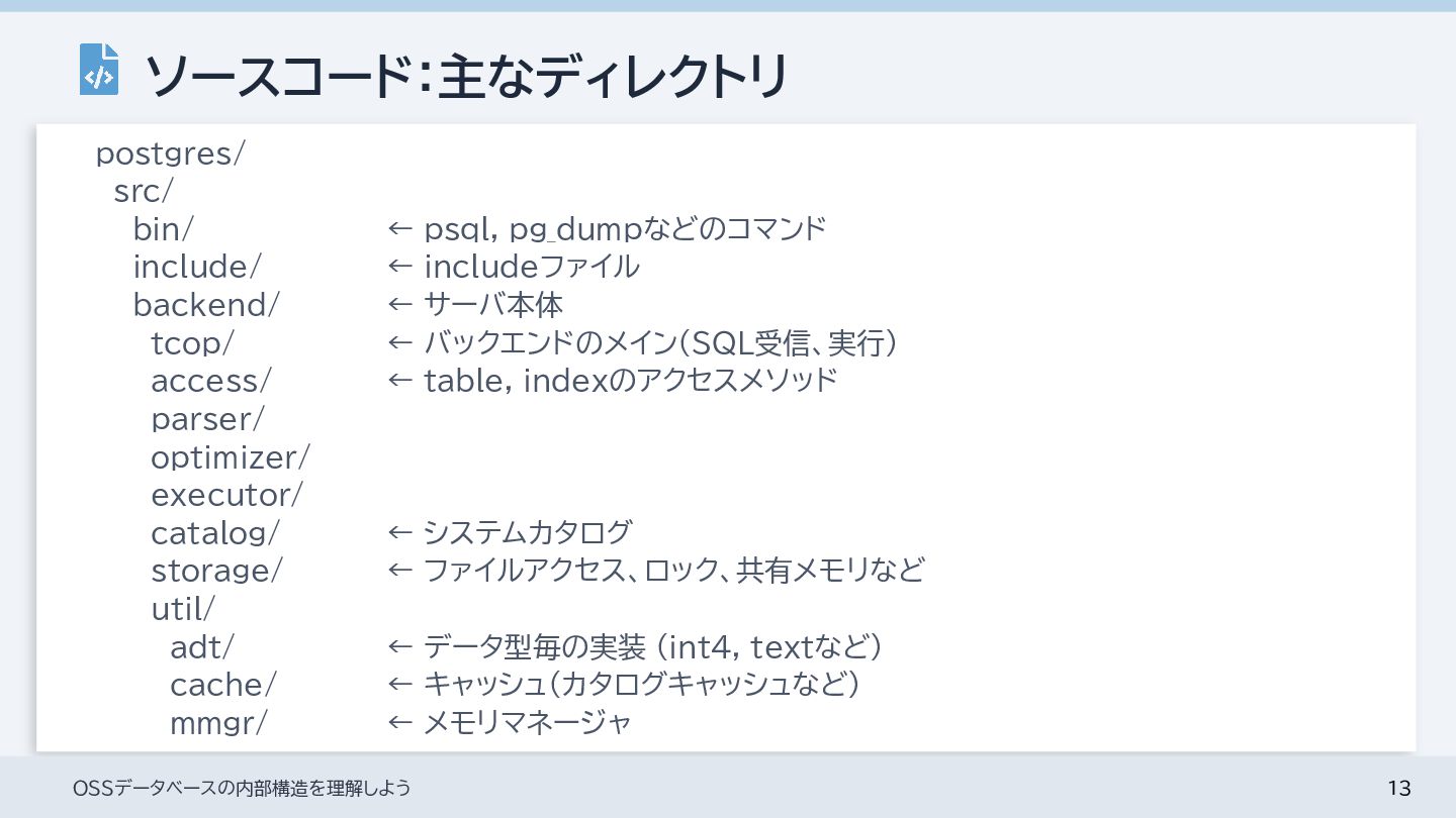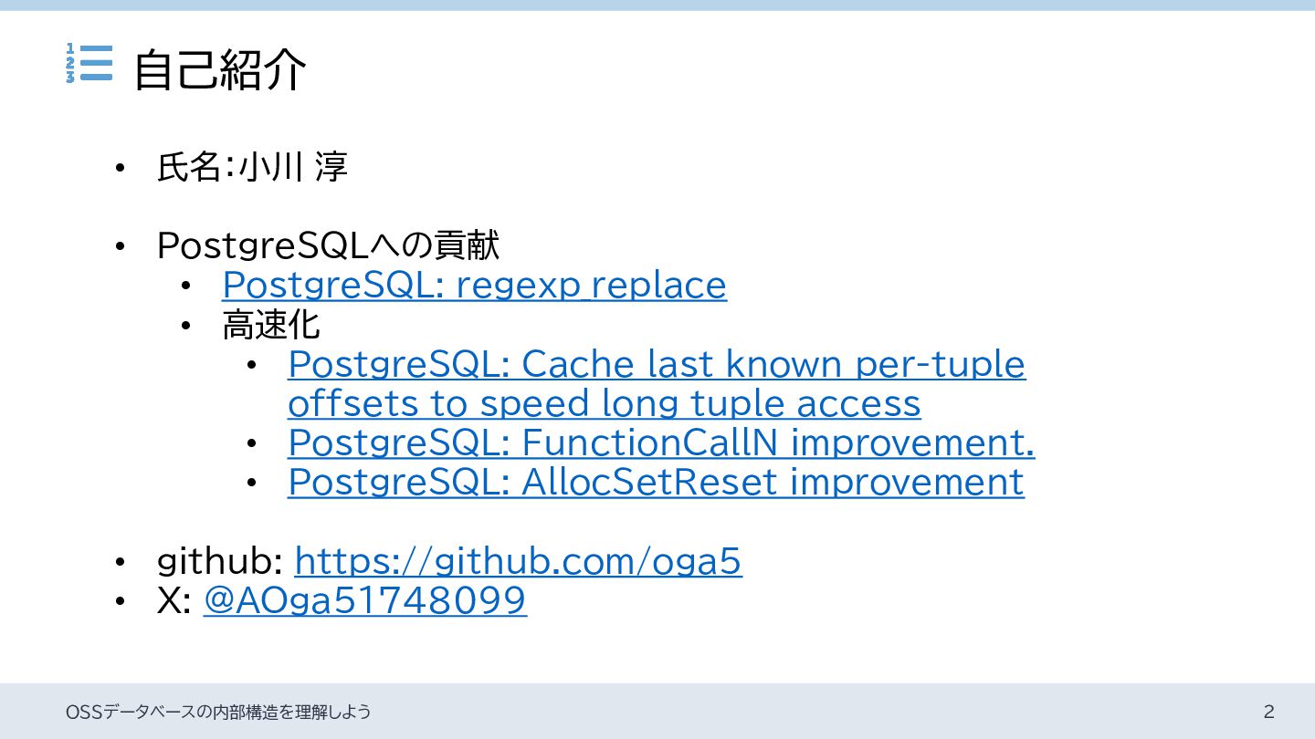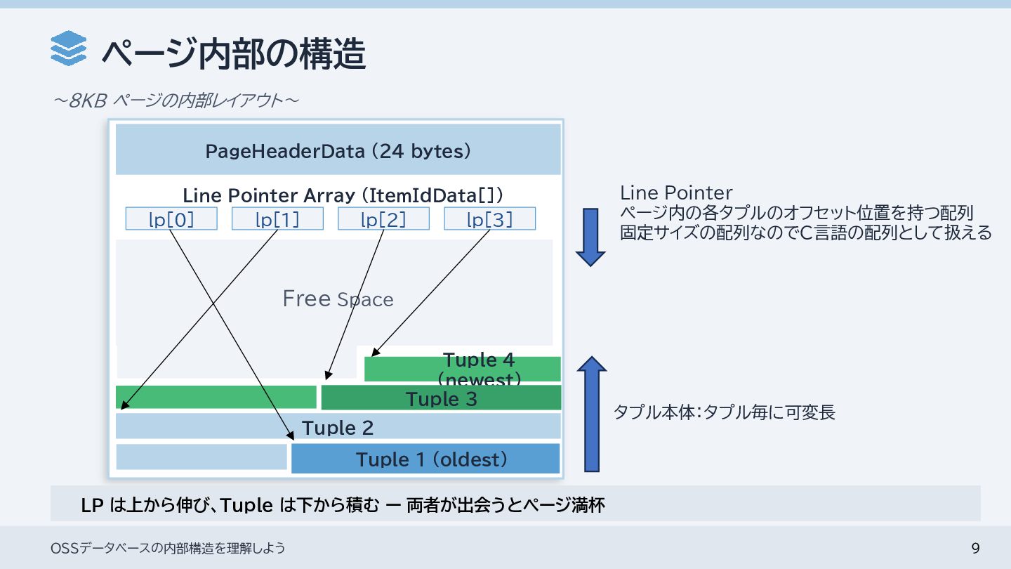 bool, value int8) Header Null Bitmap pa d id int4 name varlen text active bool 固定長型 int4, bool, int8 → そのまま格納 (例: int4は4バイト, boolは1バイト) 可変長型 text, varchar → 先頭に長さ情報 (varlen)。その後ろにテキスト。NULL終端しない Null Bitmap 各カラムが NULL かどうかを 1bit で管理。NULLが存在しないタプルはNull Bitmapは省略 value int8 pa d pad 次のカラムをその型が要求する境界に揃えるために挿入される空きバイト int4なら4で割り切れるメモリ番地に配置する Header 固定長のヘッダ。トランザクション可視性(xmin/xmax)や各種フラグなどがある OSSデータベースの内部構造を理解しよう 10