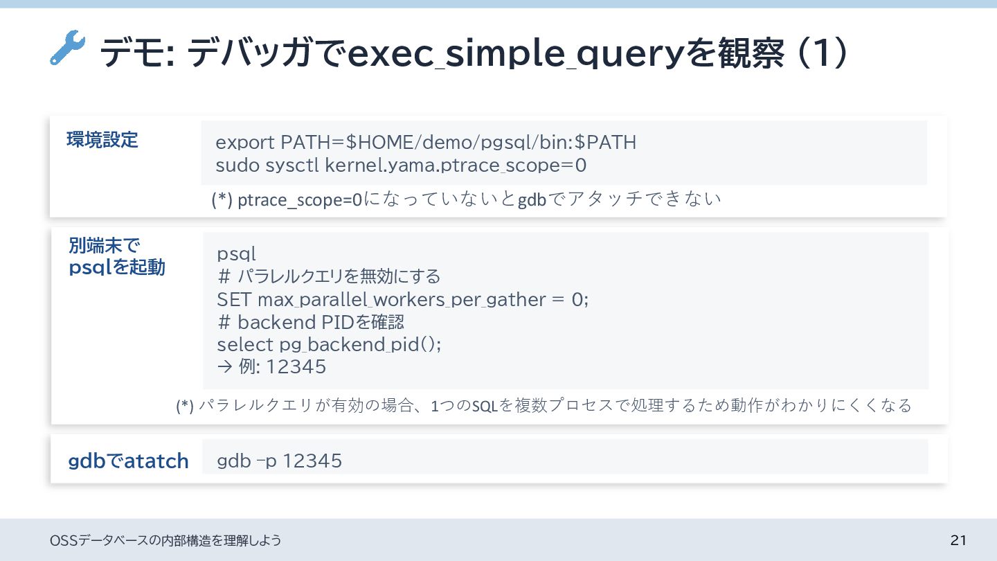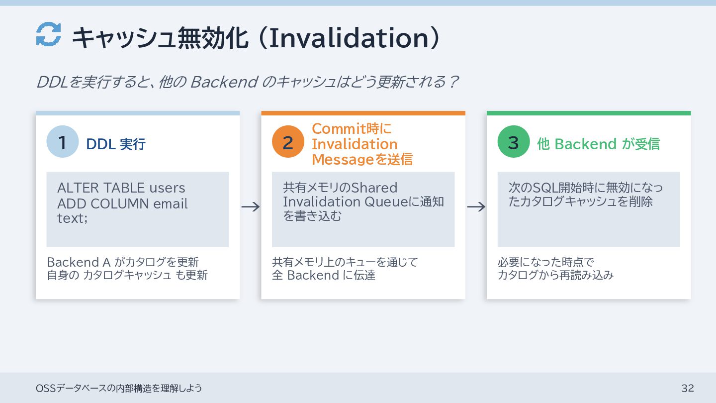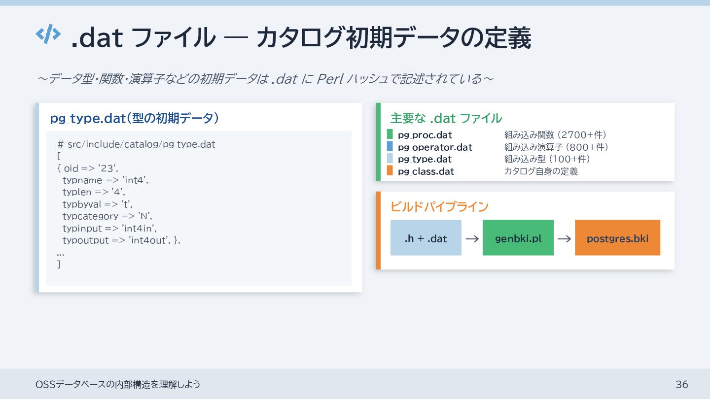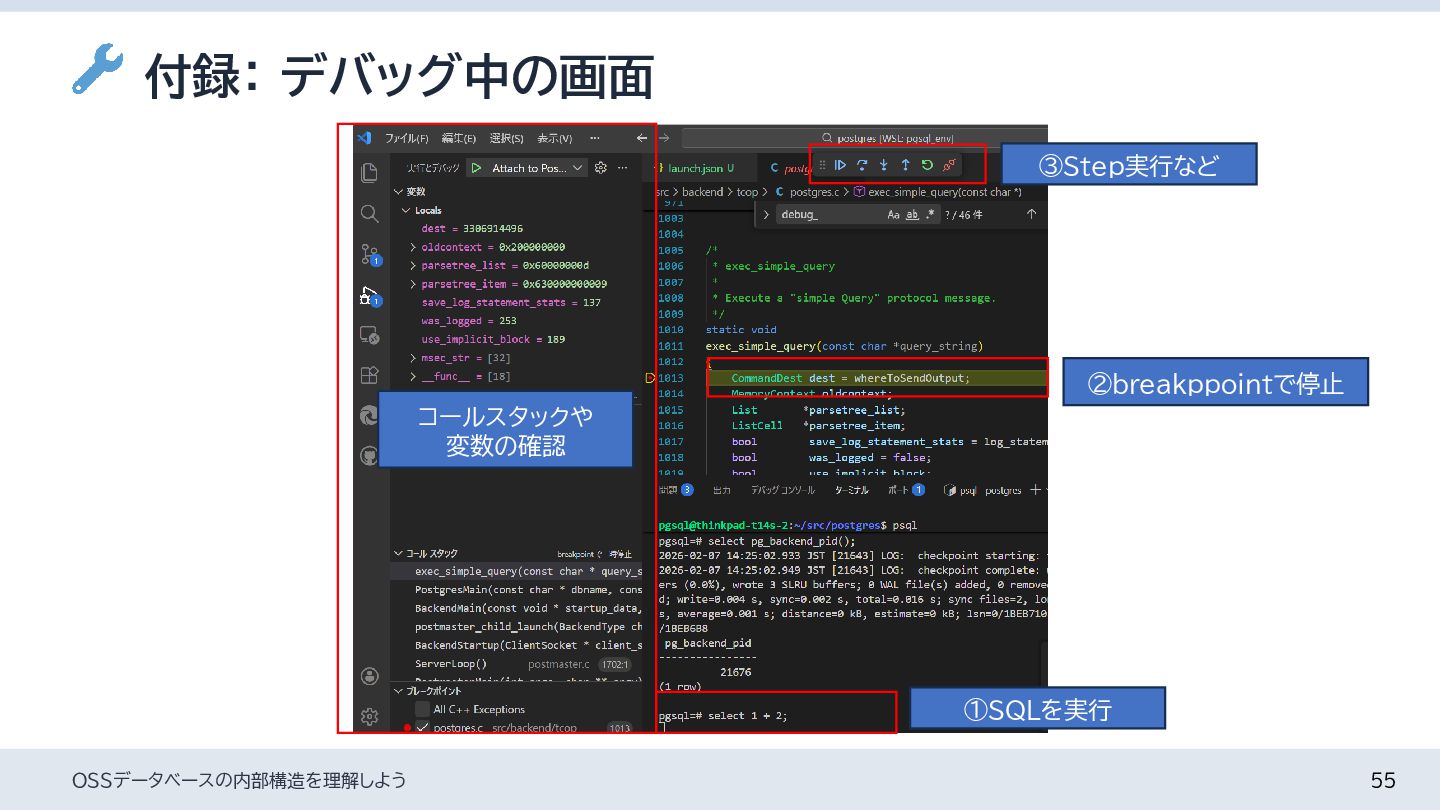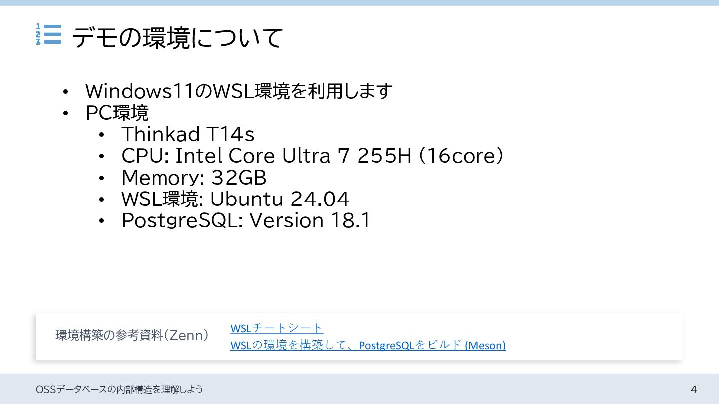 bool, value int8) Header Null Bitmap pa d id int4 name varlen text active bool 固定長型 int4, bool, int8 → そのまま格納 (例: int4は4バイト, boolは1バイト) 可変長型 text, varchar → 先頭に長さ情報 (varlen)。その後ろにテキスト。NULL終端しない Null Bitmap 各カラムが NULL かどうかを 1bit で管理。NULLが存在しないタプルはNull Bitmapは省略 value int8 pa d pad 次のカラムをその型が要求する境界に揃えるために挿入される空きバイト int4なら4で割り切れるメモリ番地に配置する Header 固定長のヘッダ。トランザクション可視性(xmin/xmax)や各種フラグなどがある OSSデータベースの内部構造を理解しよう 10