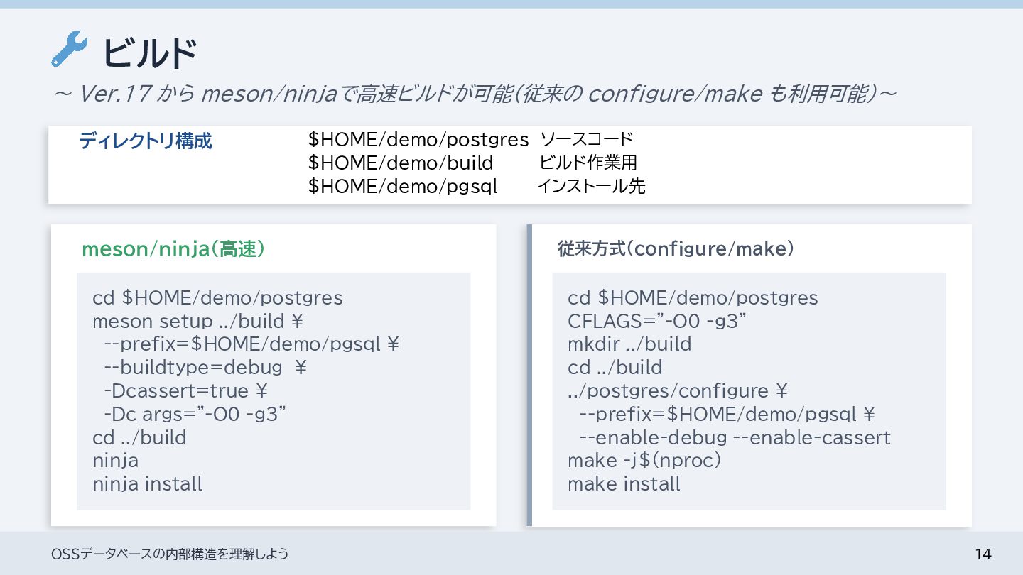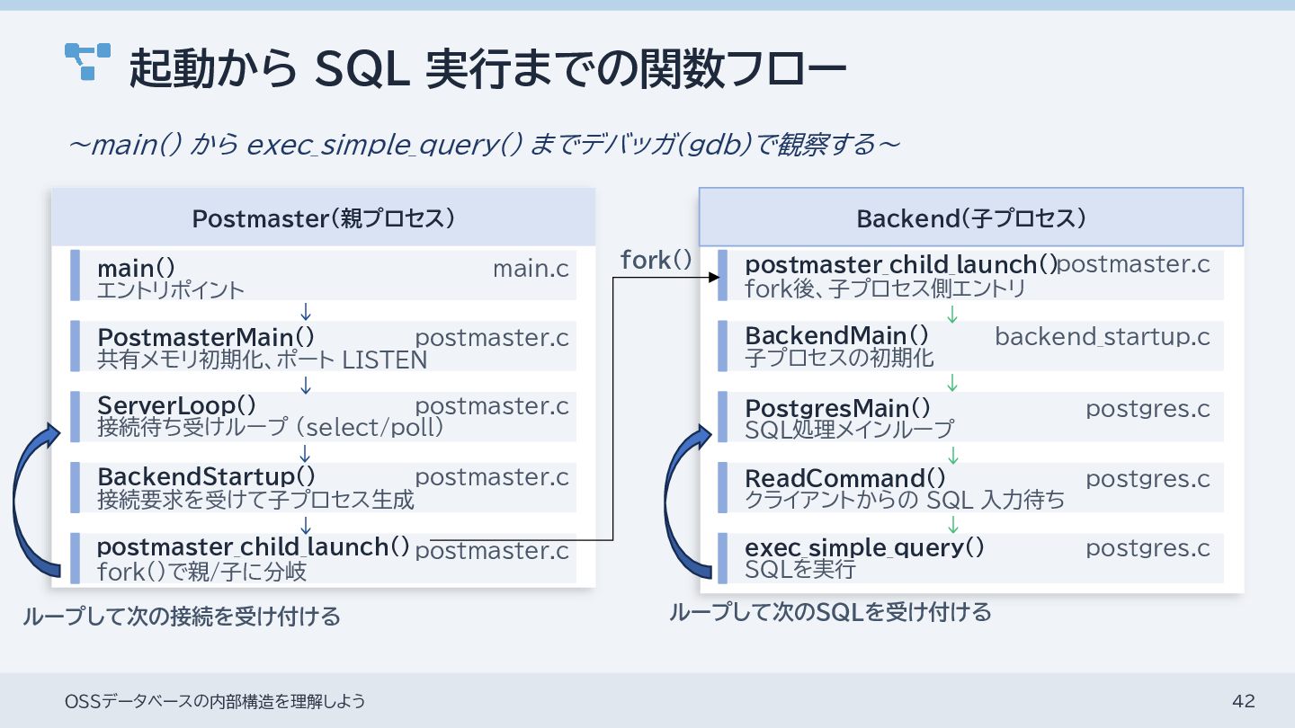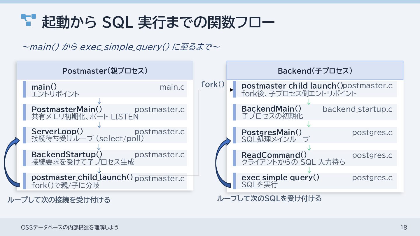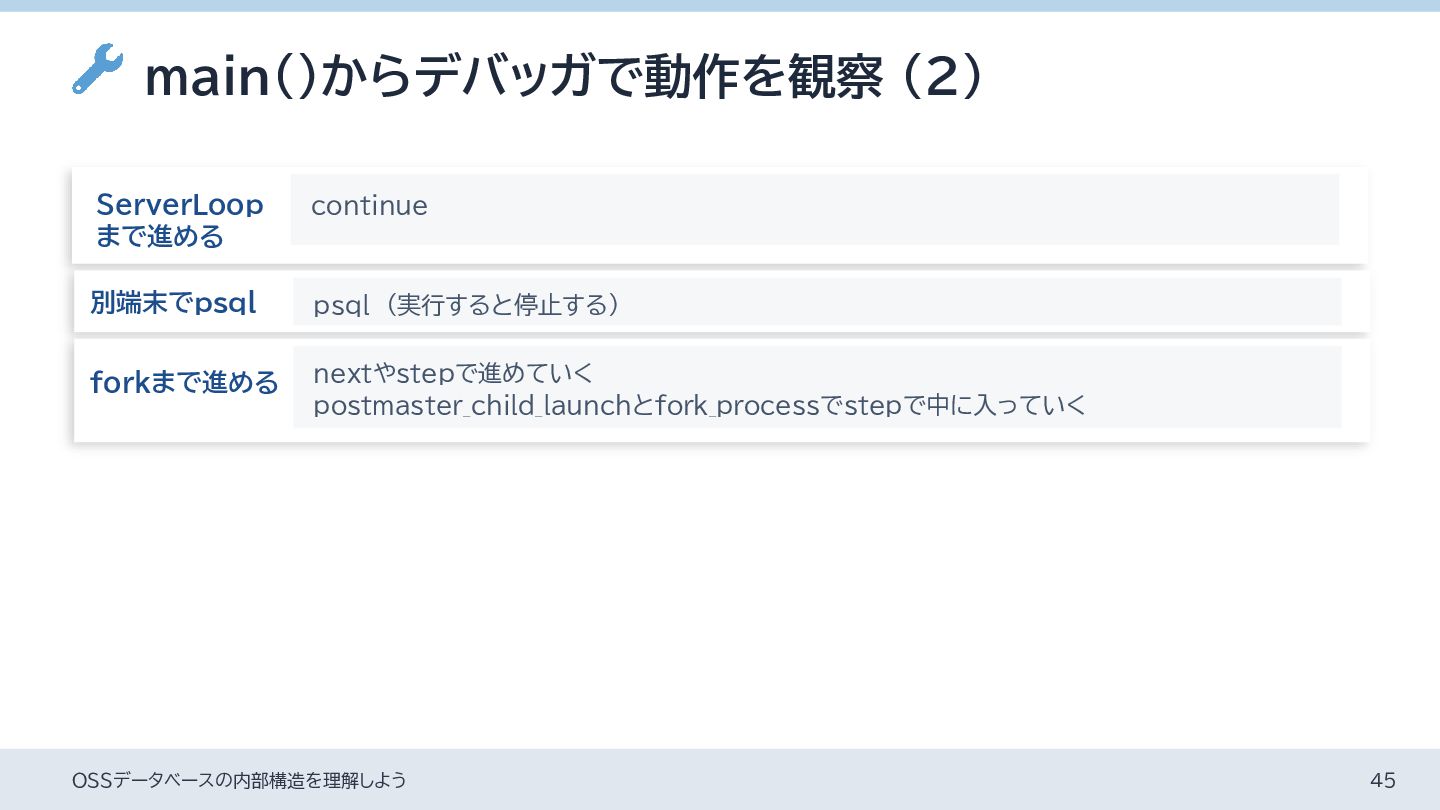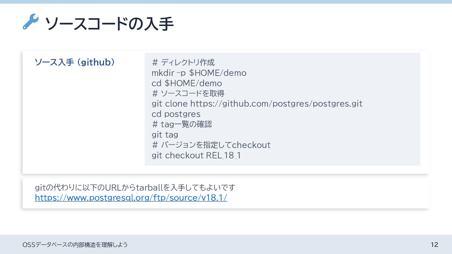 bool, value int8) Header Null Bitmap pa d id int4 name varlen text active bool 固定長型 int4, bool, int8 → そのまま格納 (例: int4は4バイト, boolは1バイト) 可変長型 text, varchar → 先頭に長さ情報 (varlen)。その後ろにテキスト。NULL終端しない Null Bitmap 各カラムが NULL かどうかを 1bit で管理。NULLが存在しないタプルはNull Bitmapは省略 value int8 pa d pad 次のカラムをその型が要求する境界に揃えるために挿入される空きバイト int4なら4で割り切れるメモリ番地に配置する Header 固定長のヘッダ。トランザクション可視性(xmin/xmax)や各種フラグなどがある OSSデータベースの内部構造を理解しよう 10