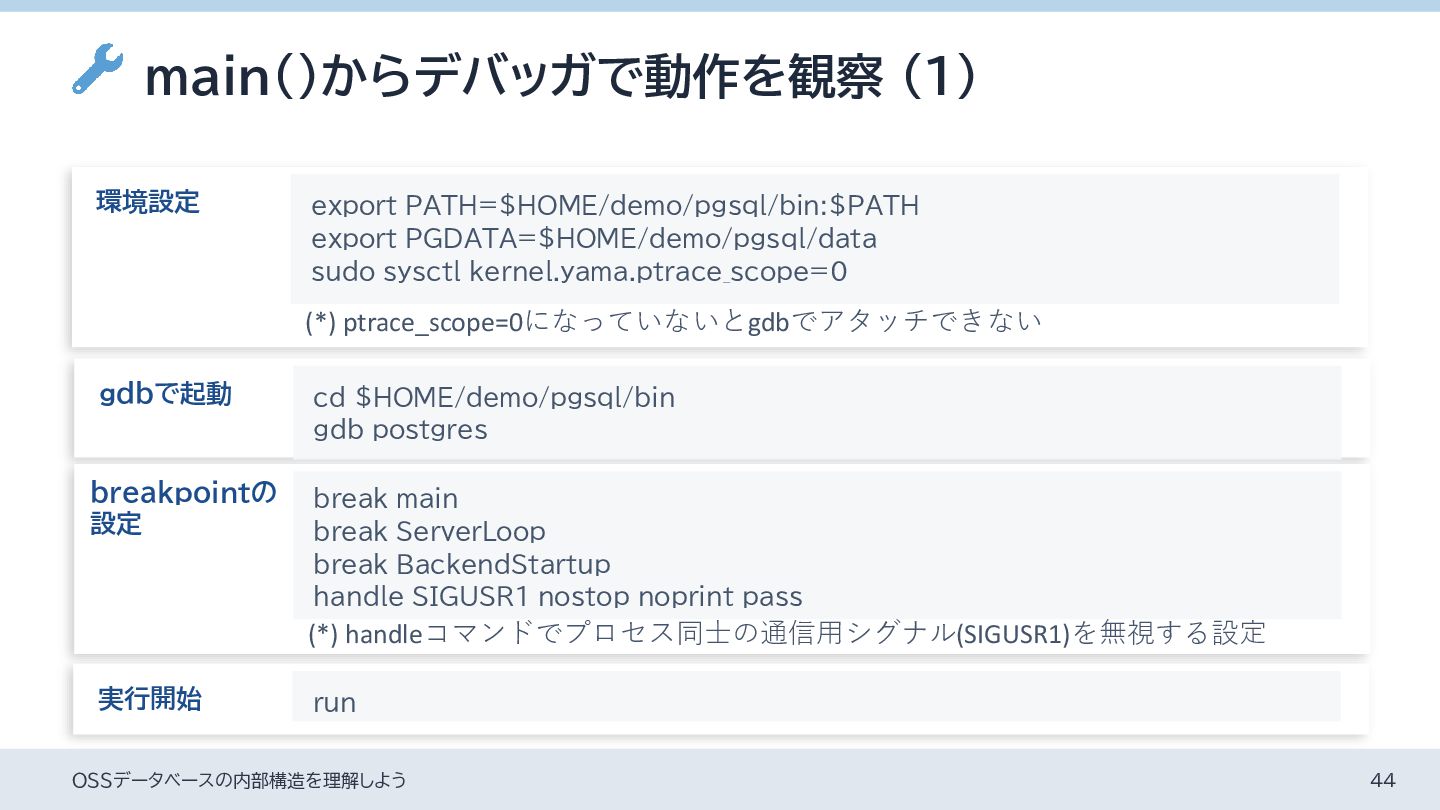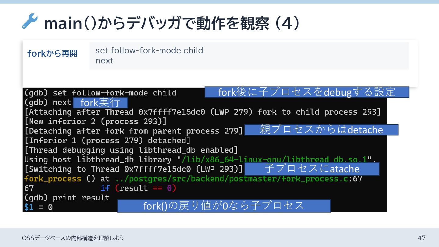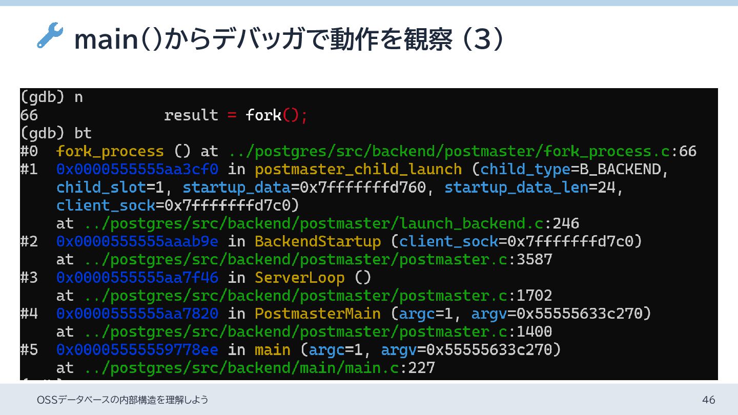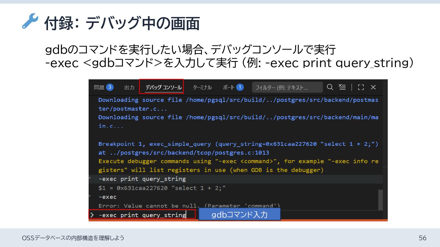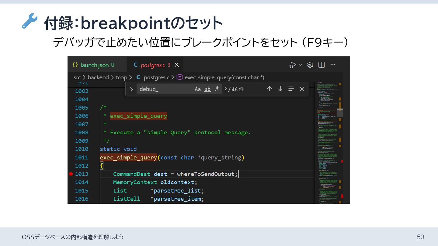 bool, value int8) Header Null Bitmap pa d id int4 name varlen text active bool 固定長型 int4, bool, int8 → そのまま格納 (例: int4は4バイト, boolは1バイト) 可変長型 text, varchar → 先頭に長さ情報 (varlen)。その後ろにテキスト。NULL終端しない Null Bitmap 各カラムが NULL かどうかを 1bit で管理。NULLが存在しないタプルはNull Bitmapは省略 value int8 pa d pad 次のカラムをその型が要求する境界に揃えるために挿入される空きバイト int4なら4で割り切れるメモリ番地に配置する Header 固定長のヘッダ。トランザクション可視性(xmin/xmax)や各種フラグなどがある OSSデータベースの内部構造を理解しよう 10