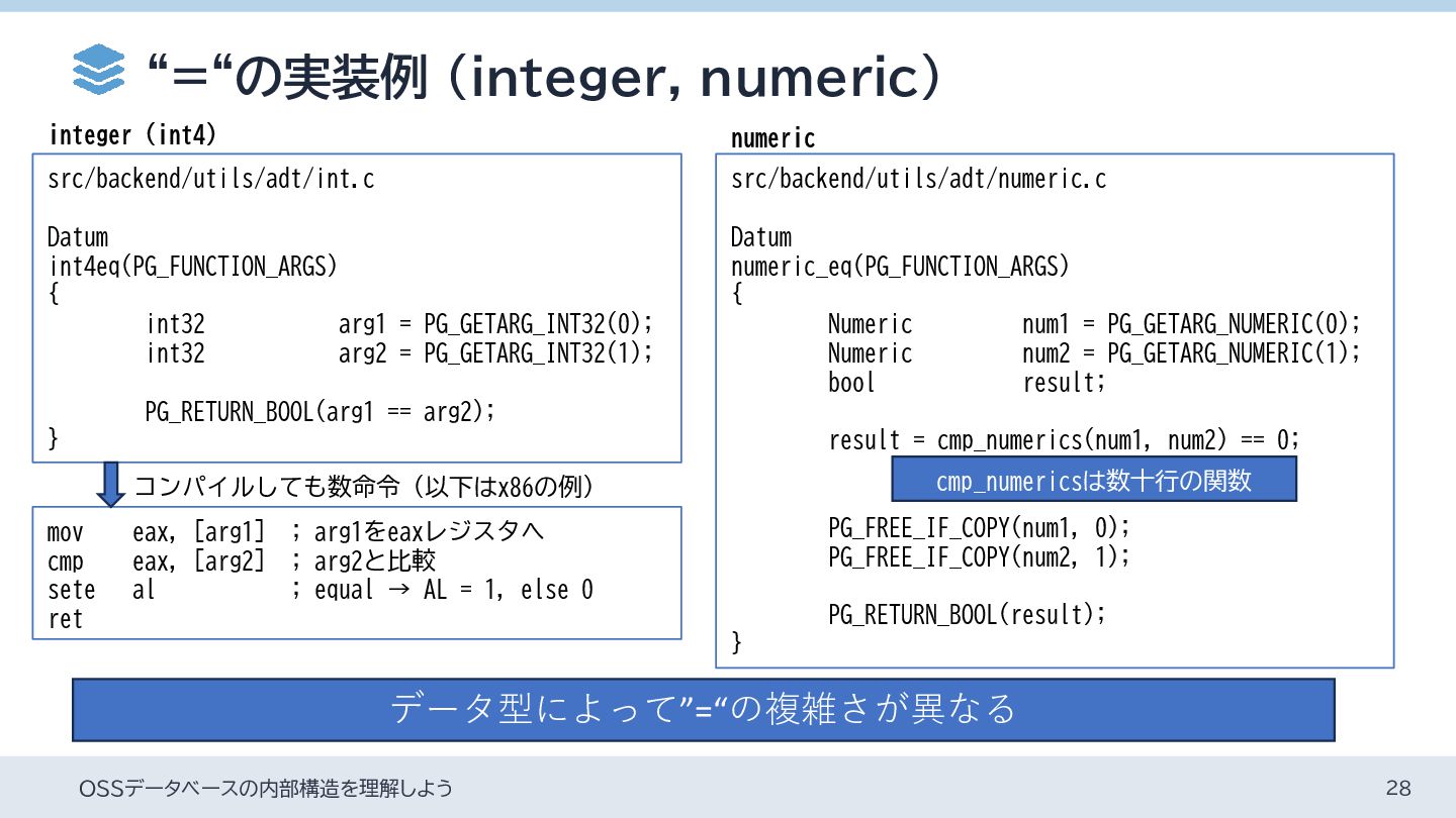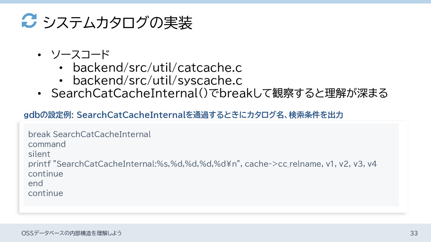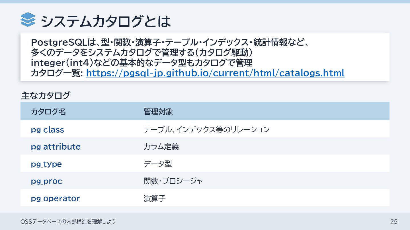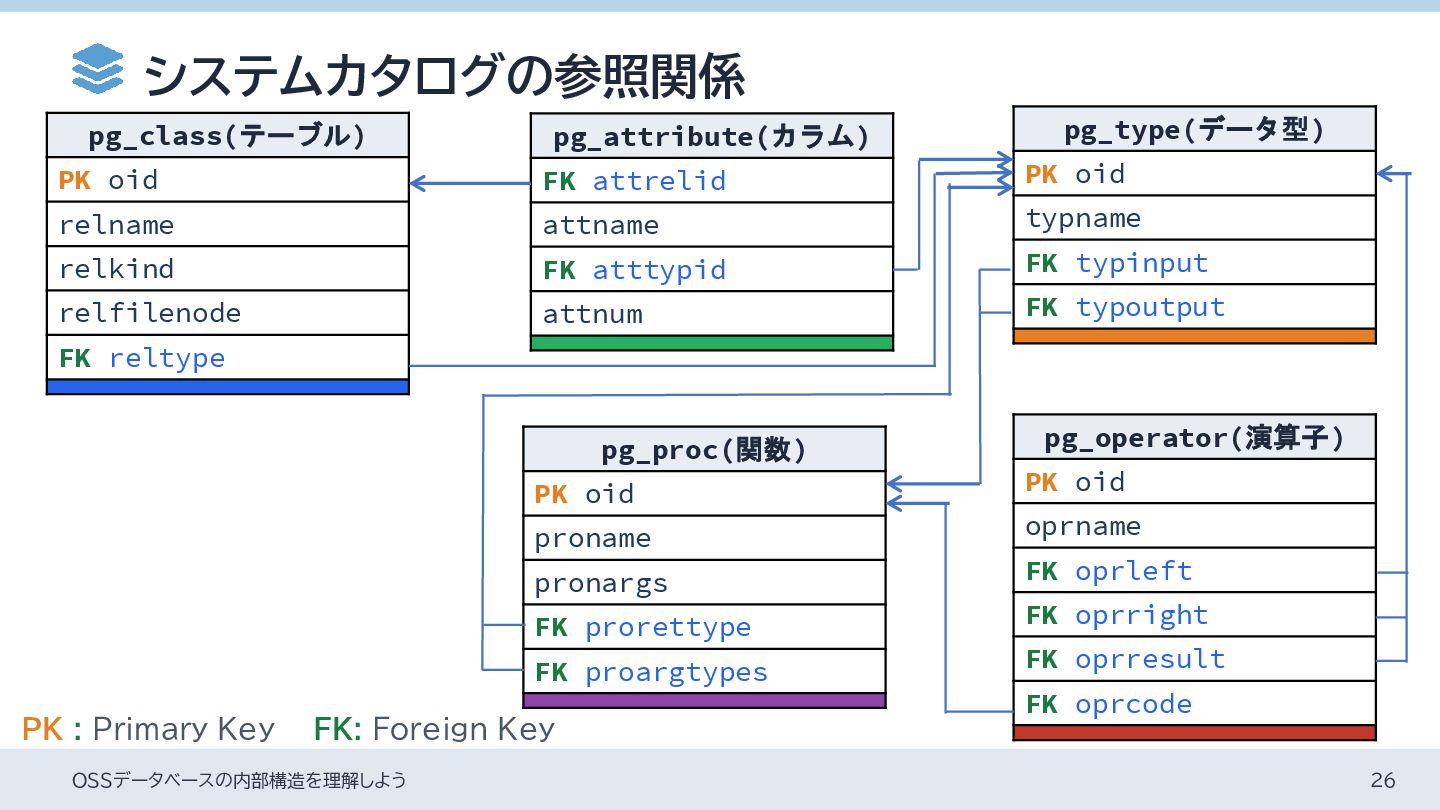 relname relkind relfilenode FK reltype pg_attribute(カラム) FK attrelid attname FK atttypid attnum pg_type(データ型) PK oid typname FK typinput FK typoutput pg_proc(関数) PK oid proname pronargs FK prorettype FK proargtypes pg_operator(演算子) PK oid oprname FK oprleft FK oprright FK oprresult FK oprcode システムカタログの参照関係 OSSデータベースの内部構造を理解しよう 26
