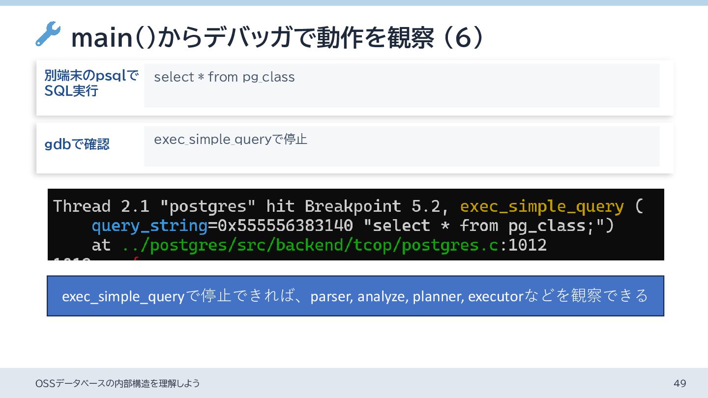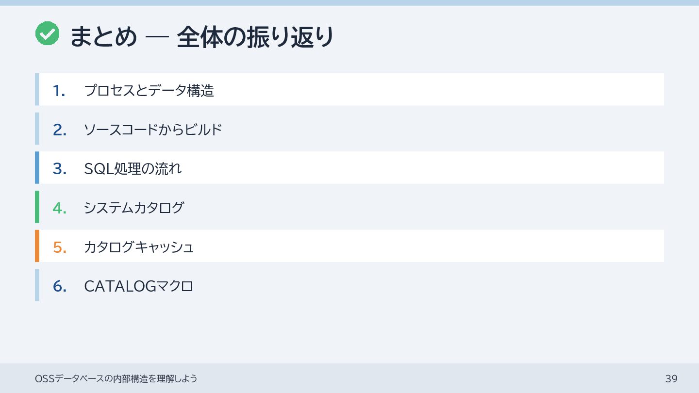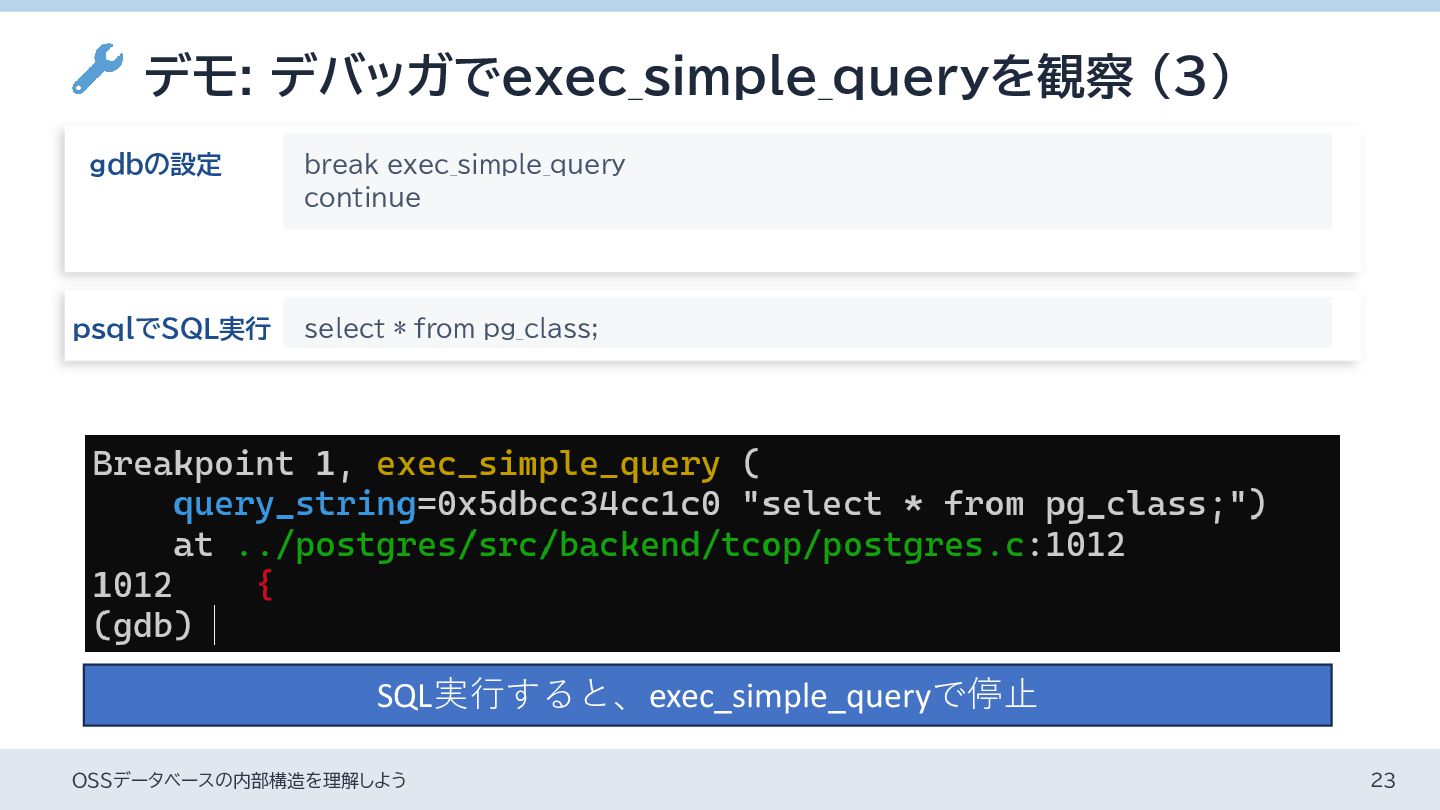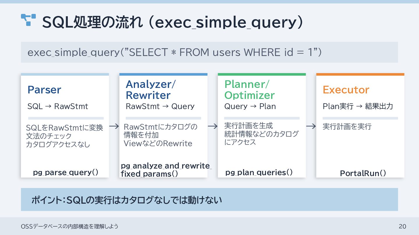 relname relkind relfilenode FK reltype pg_attribute(カラム) FK attrelid attname FK atttypid attnum pg_type(データ型) PK oid typname FK typinput FK typoutput pg_proc(関数) PK oid proname pronargs FK prorettype FK proargtypes pg_operator(演算子) PK oid oprname FK oprleft FK oprright FK oprresult FK oprcode システムカタログの参照関係 OSSデータベースの内部構造を理解しよう 26