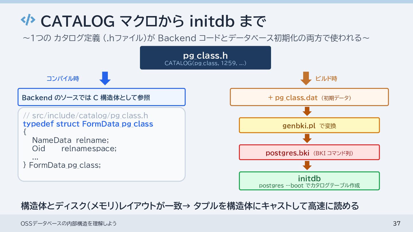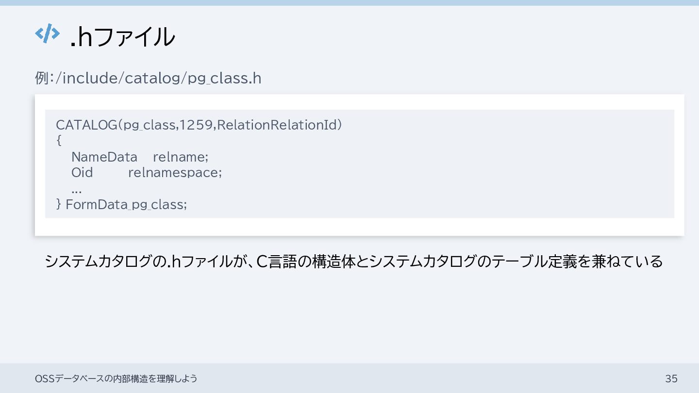 • relnameなどの文字列もNAME型(64バイト固定長)にしている • 可変長やNULLABLEなカラムはテーブルの末尾に配置 • 固定長部分は同じメモリレイアウトにすることで、高速アクセスを実現 Header Null Bitmap pa d oid OID(4byte) name NAME(64byte) active bool value int8 pa d タプルの前方は固定長かつNOT NULLの データ型を利用することで、全てのタプルが 同じメモリレイアウトになる acl aclitem[] 可変長や NULLABLEは 後方に配置