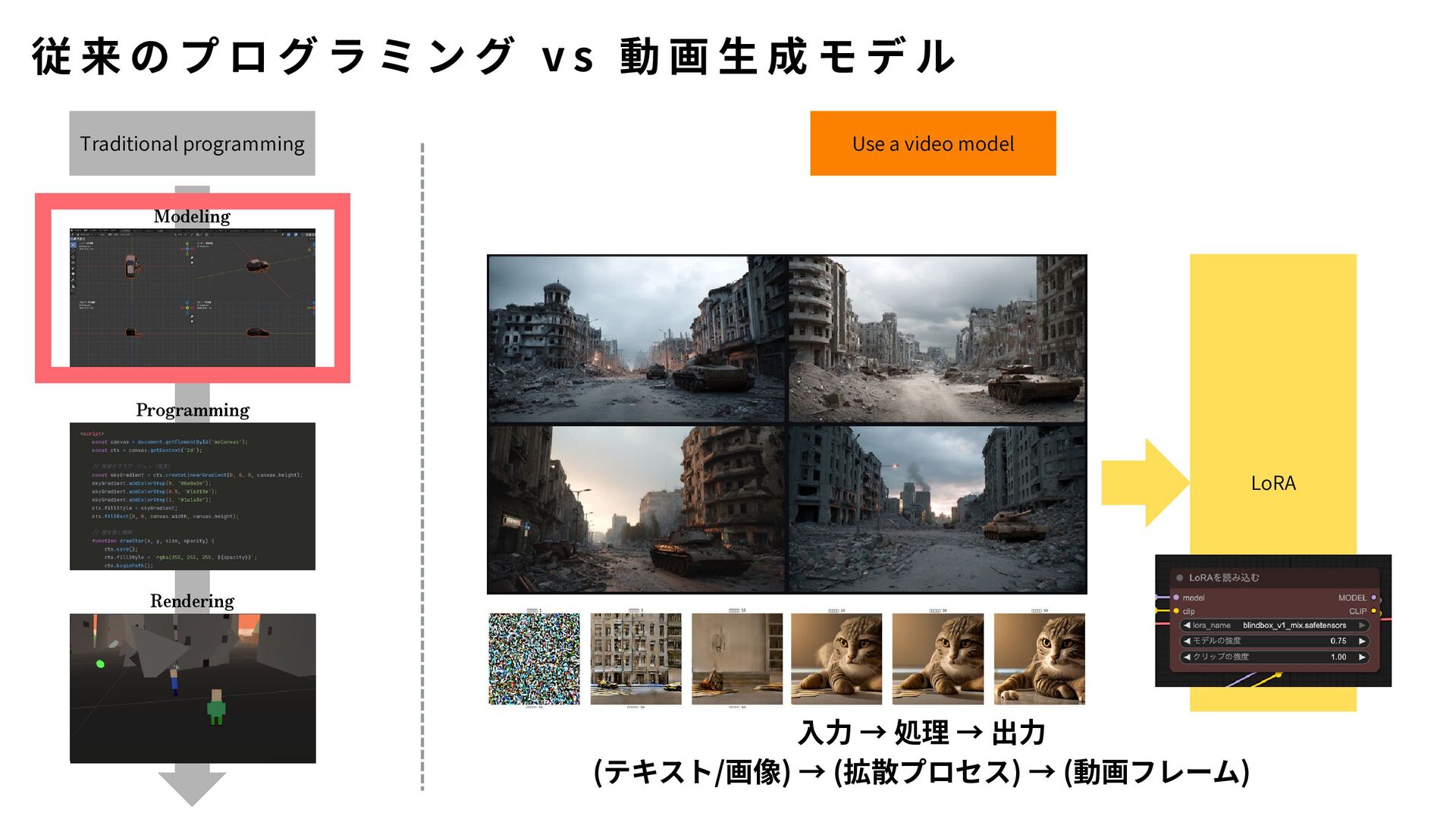 来 の プ ロ グ ラ ミ ン グ v s 動 画 生 成 モ デ ル LoRA 入力 → 処理 → 出力 (テキスト/画像) → (拡散プロセス) → (動画フレーム)