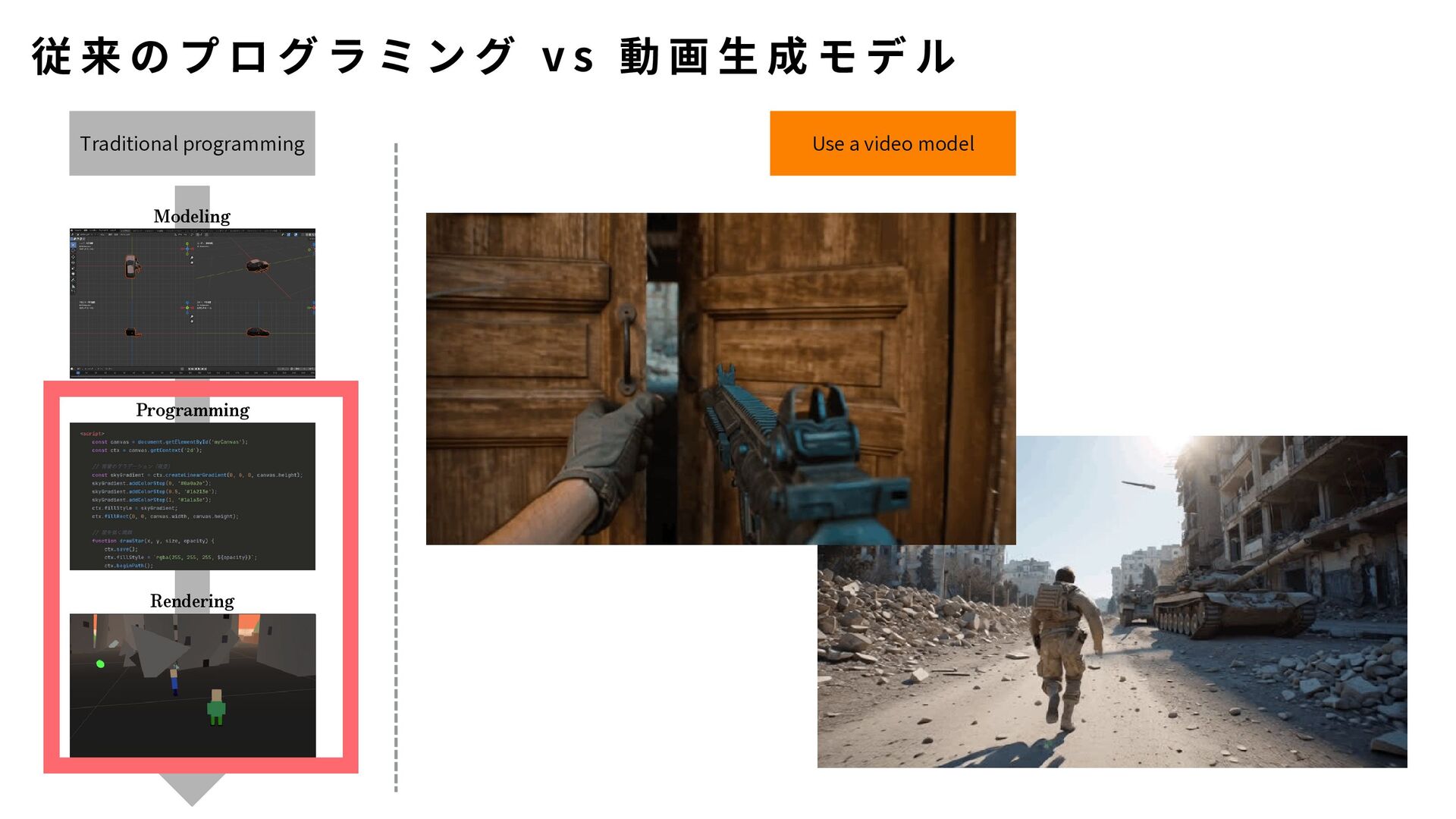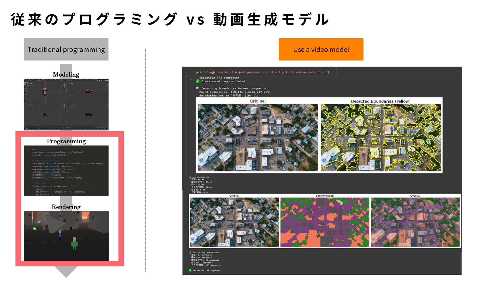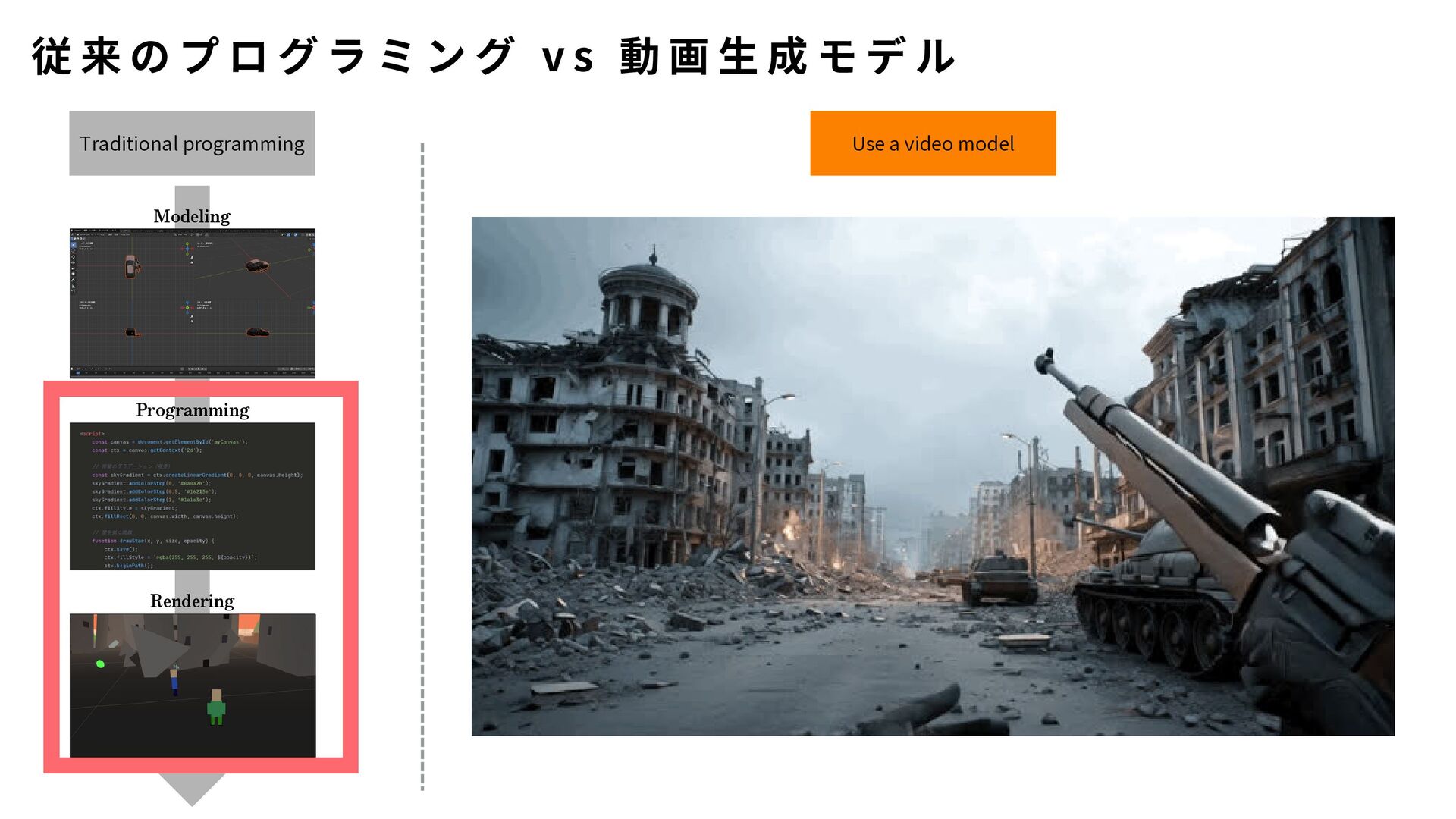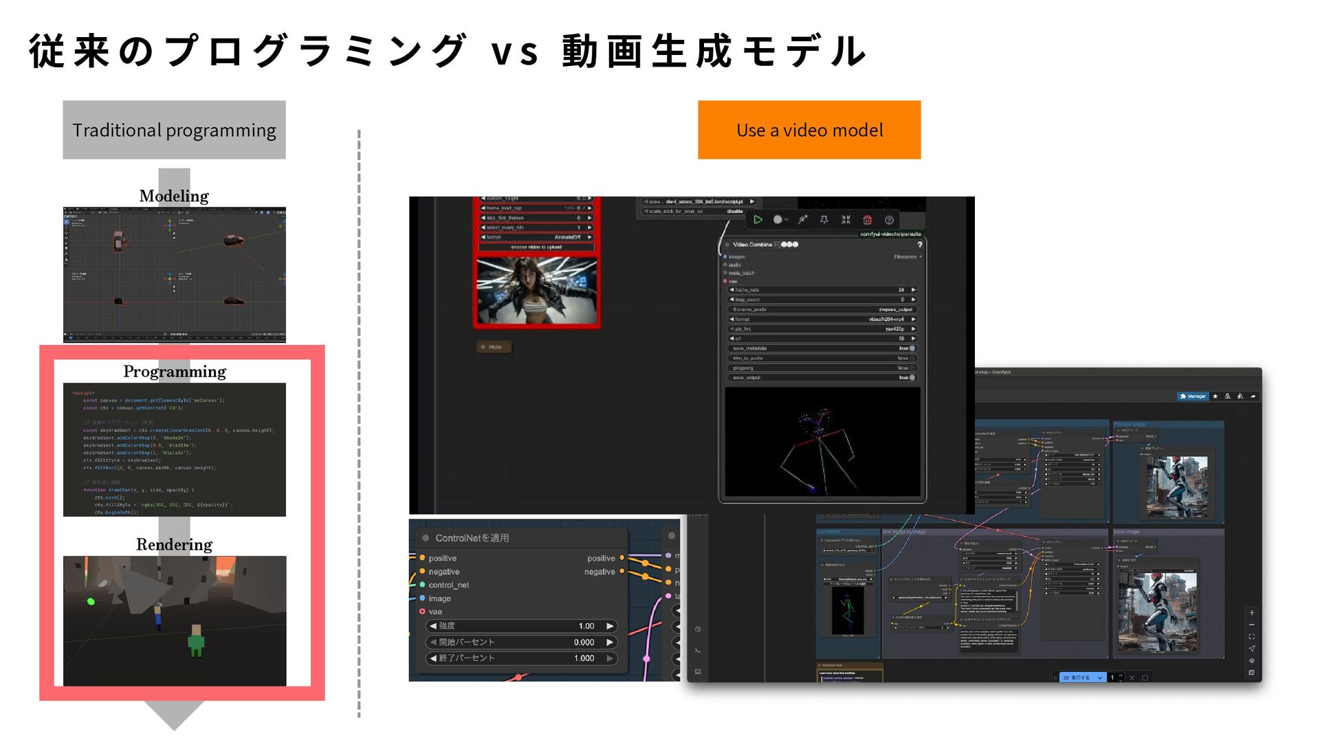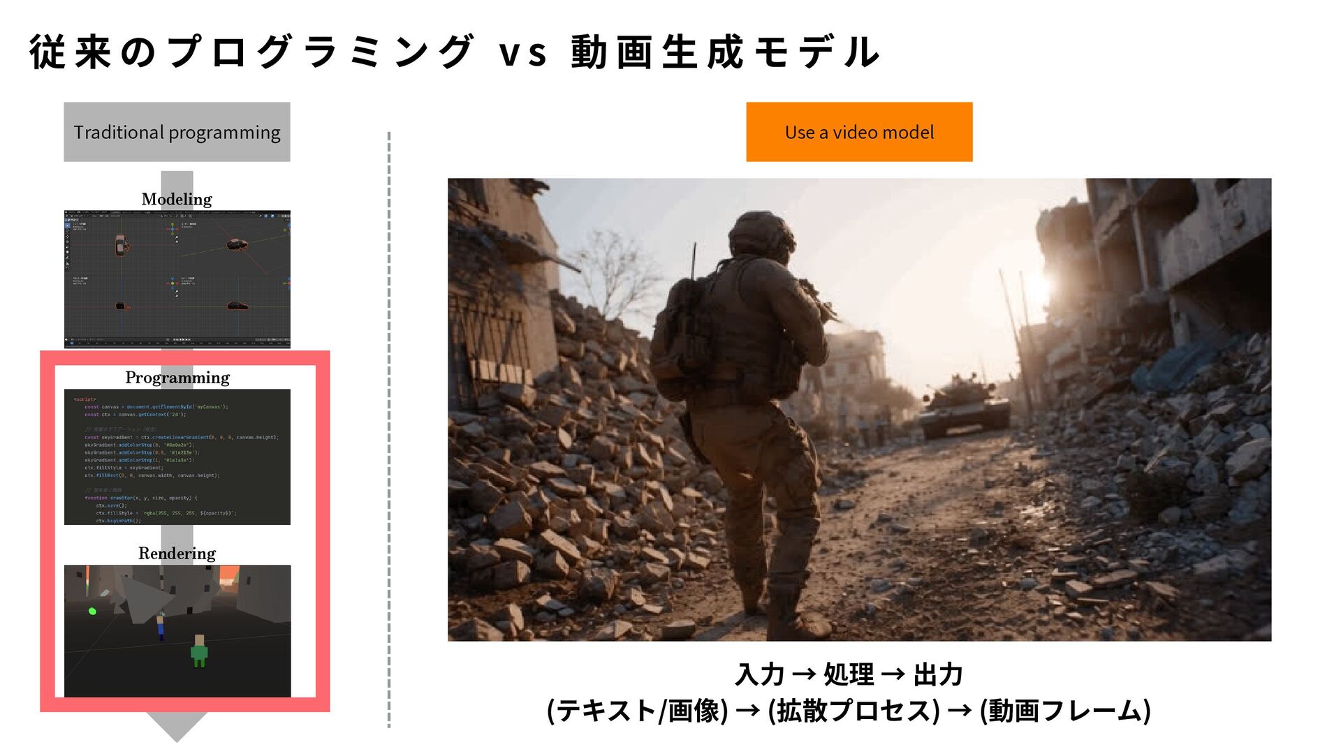 従 来 の プ ロ グ ラ ミ ン グ v s 動 画 生 成 モ デ ル