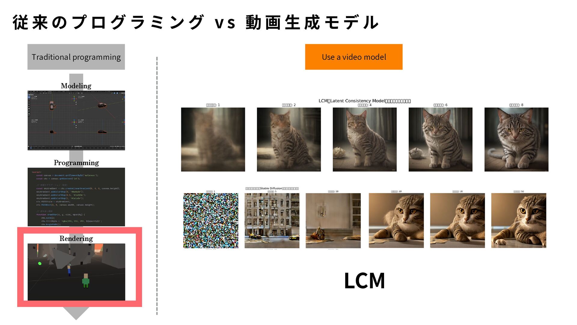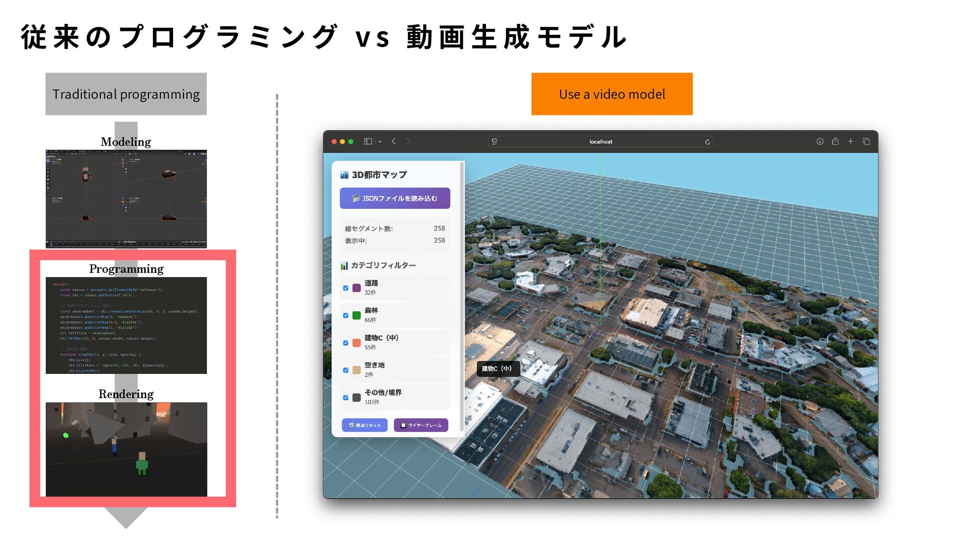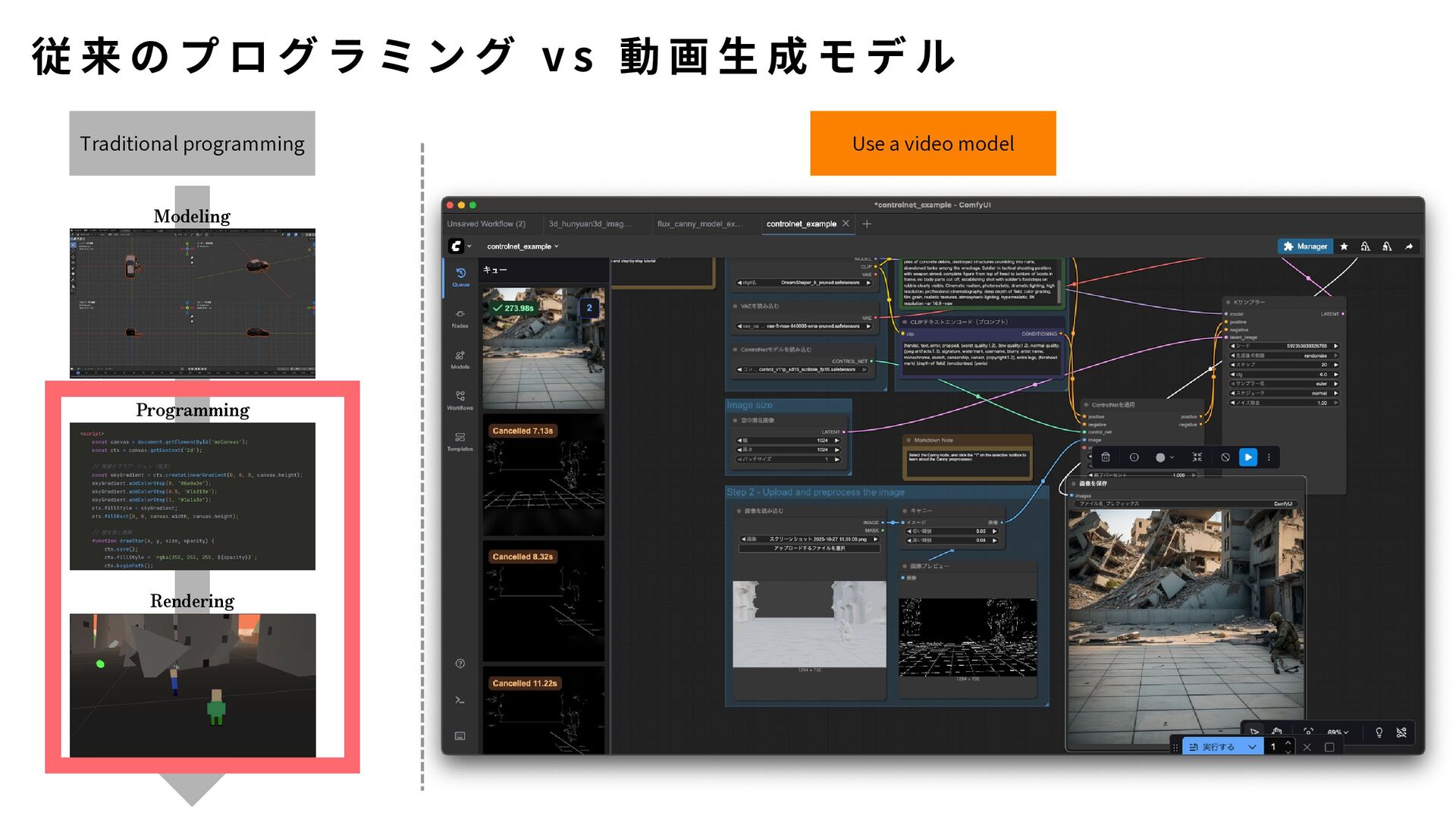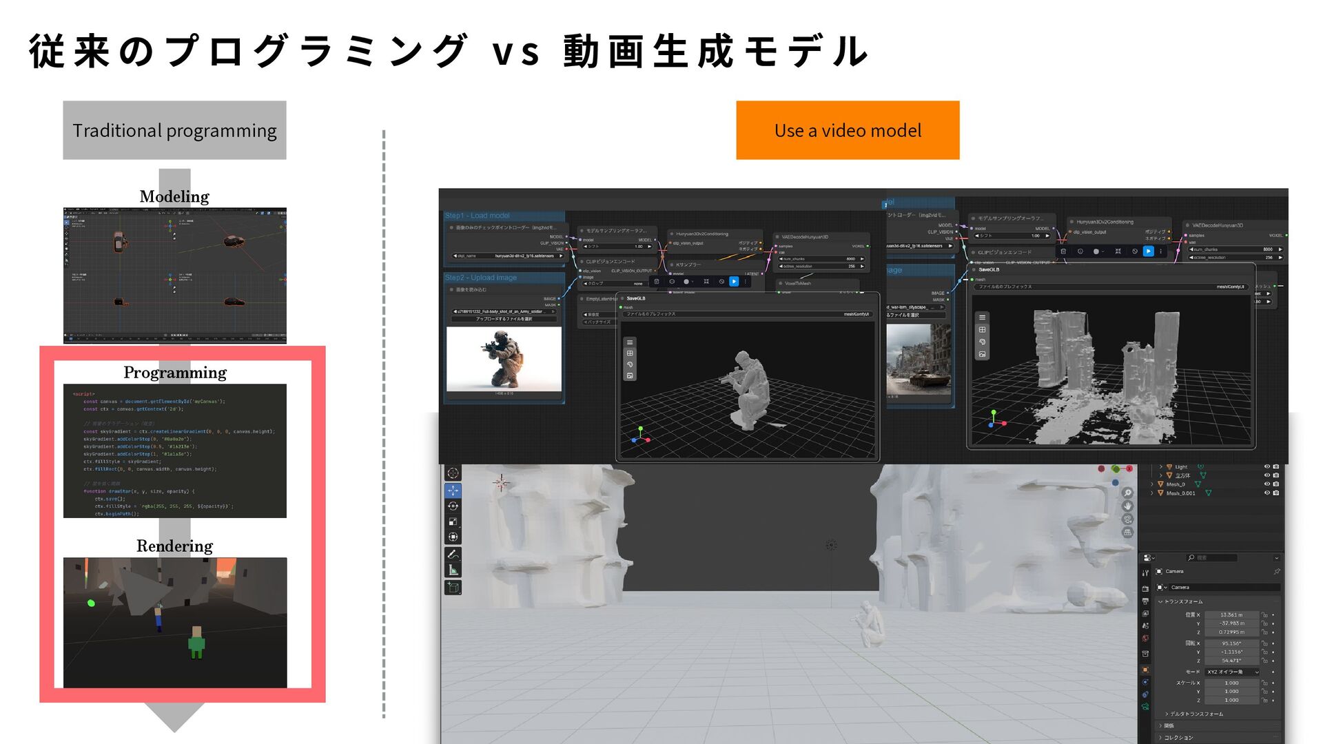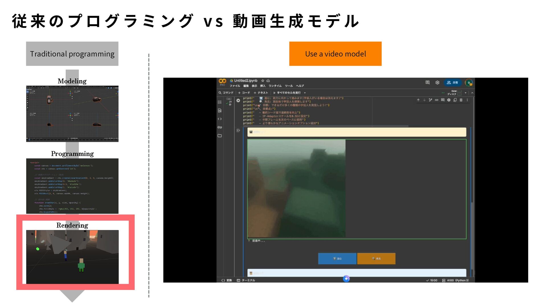 従 来 の プ ロ グ ラ ミ ン グ v s 動 画 生 成 モ デ ル