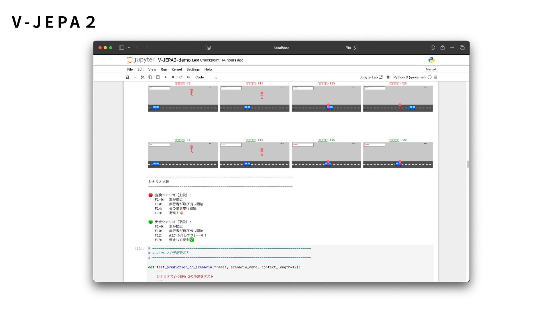 新しい動作ごとに再実装が必要 OpenCVでは難しいが、V-JEPA 2なら可能: 「コップを持ち上げる」vs「コップを倒す」の区別 「ドアを押す」vs「ドアを引く」の違い # V-JEPA 2だと... outputs = model(video) # それだけ! # 学習済みの知識で複雑な動作を理解 O p e n C V v s V - J E PA 2 https://ai.meta.com/vjepa/ から引用