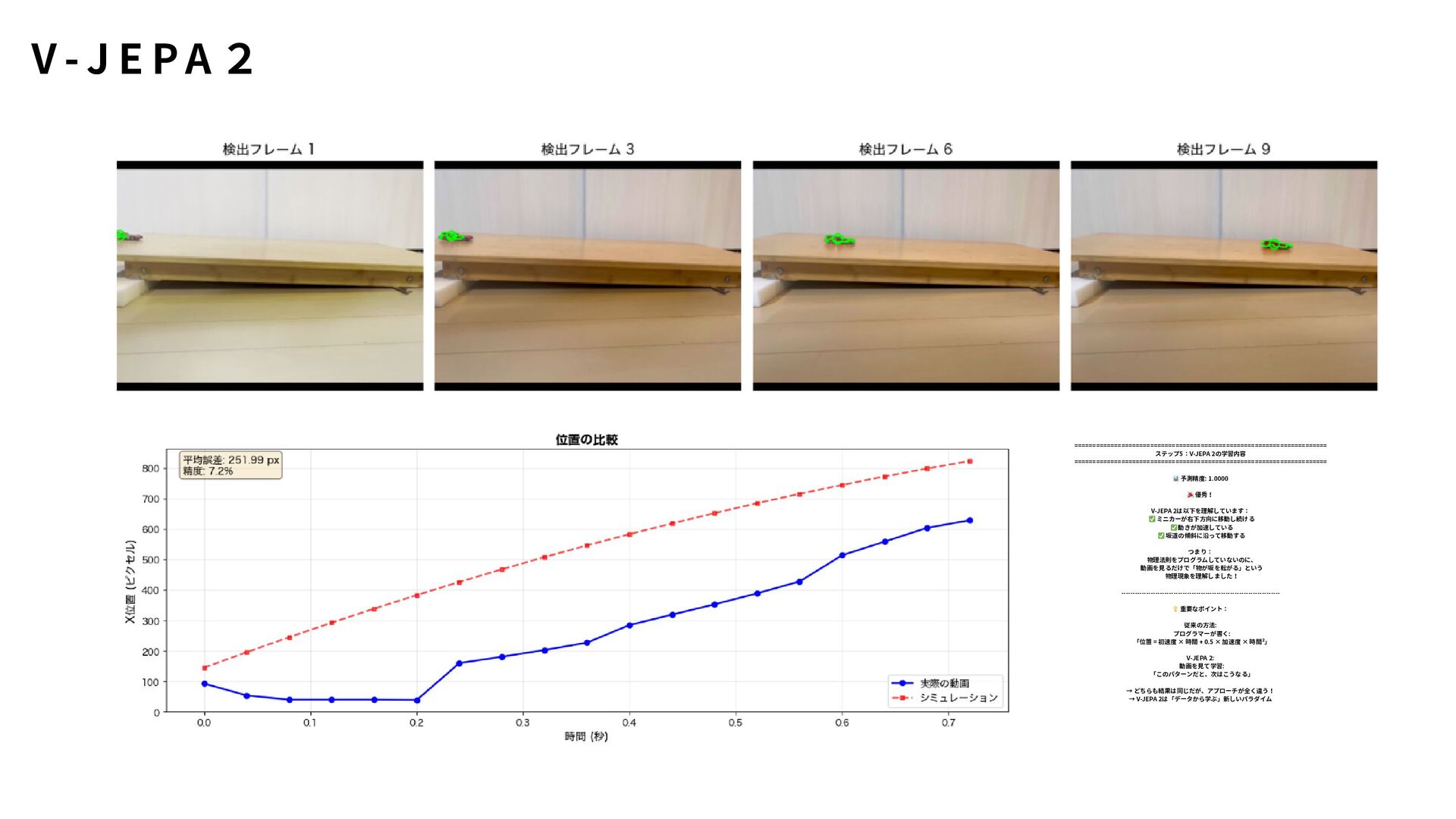 2は以下を理解しています: ✅ ミニカーが右下方向に移動し続ける ✅ 動きが加速している ✅ 坂道の傾斜に沿って移動する つまり: 物理法則をプログラムしていないのに、 動画を見るだけで「物が坂を転がる」という 物理現象を理解しました! ---------------------------------------------------------------------- 💡 重要なポイント: 従来の方法: プログラマーが書く: 「位置 = 初速度 × 時間 + 0.5 × 加速度 × 時間²」 V-JEPA 2: 動画を見て学習: 「このパターンだと、次はこうなる」 → どちらも結果は同じだが、アプローチが全く違う! → V-JEPA 2は「データから学ぶ」新しいパラダイム V - J E PA 2