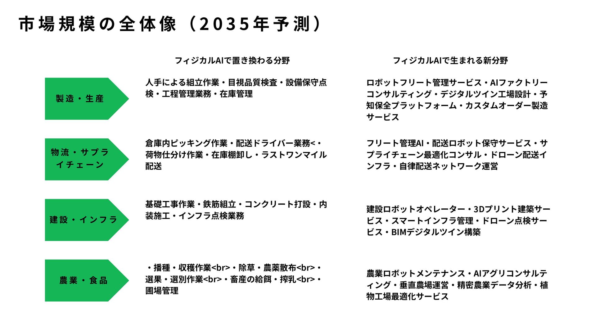 ラ イ チ ェ ー ン 建 設 ・ イ ン フ ラ 農 業 ・ 食 品 人手による組立作業・目視品質検査・設備保守点 検・工程管理業務・在庫管理 ロボットフリート管理サービス・AIファクトリー コンサルティング・デジタルツイン工場設計・予 知保全プラットフォーム・カスタムオーダー製造 サービス 倉庫内ピッキング作業・配送ドライバー業務<・ 荷物仕分け作業・在庫棚卸し・ラストワンマイル 配送 フリート管理AI・配送ロボット保守サービス・サ プライチェーン最適化コンサル・ドローン配送イ ンフラ・自律配送ネットワーク運営 基礎工事作業・鉄筋組立・コンクリート打設・内 装施工・インフラ点検業務 建設ロボットオペレーター・3Dプリント建築サー ビス・スマートインフラ管理・ドローン点検サー ビス・BIMデジタルツイン構築 ・播種・収穫作業<br>・除草・農薬散布<br>・ 選果・選別作業<br>・畜産の給餌・搾乳<br>・ 圃場管理 農業ロボットメンテナンス・AIアグリコンサルテ ィング・垂直農場運営・精密農業データ分析・植 物工場最適化サービス フィジカルAIで置き換わる分野 フィジカルAIで生まれる新分野 市 場 規 模 の 全 体 像 ( 2 0 3 5 年 予 測 )