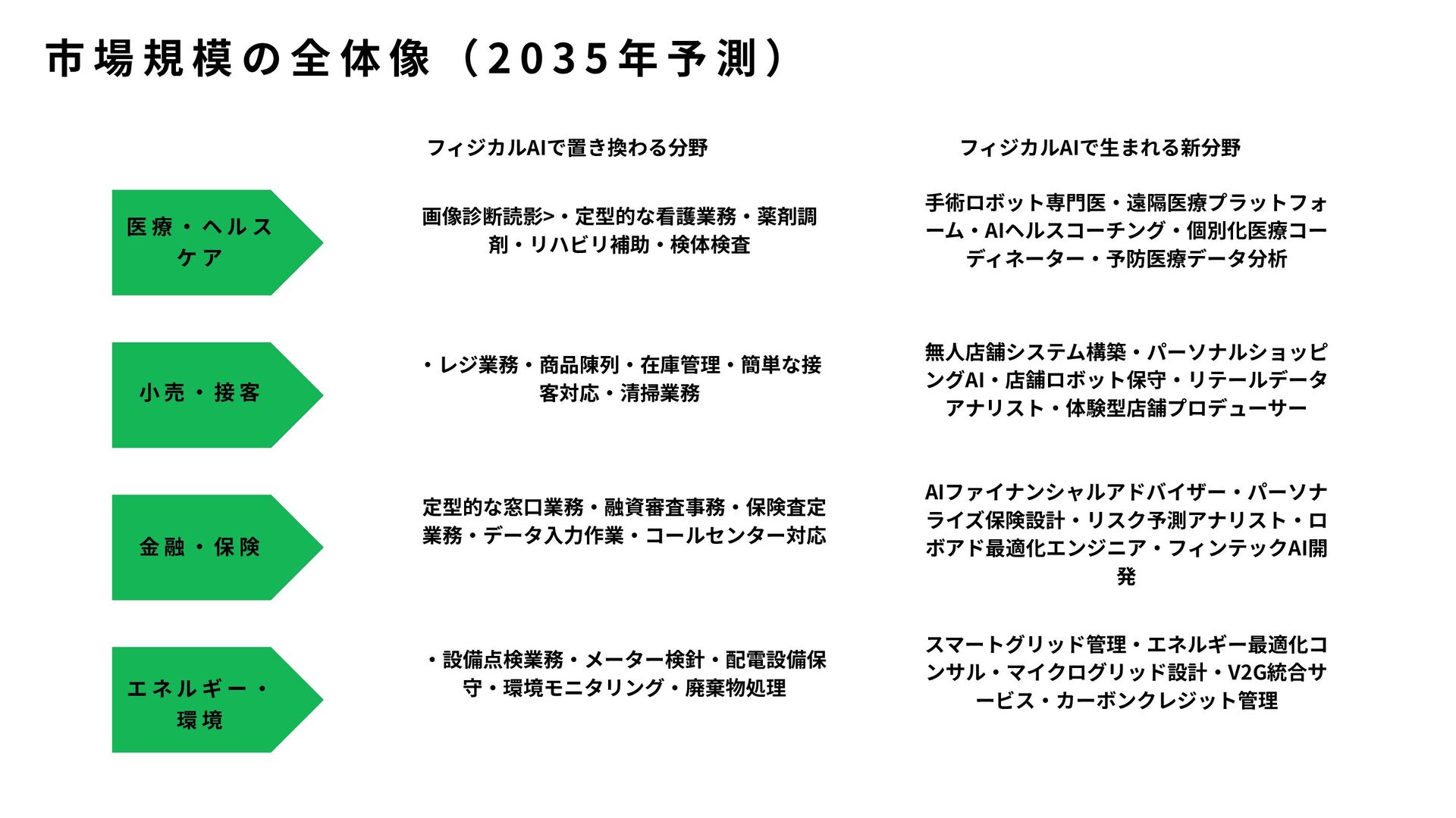 ・ 接 客 金 融 ・ 保 険 エ ネ ル ギ ー ・ 環 境 画像診断読影>・定型的な看護業務・薬剤調 剤・リハビリ補助・検体検査 手術ロボット専門医・遠隔医療プラットフォ ーム・AIヘルスコーチング・個別化医療コー ディネーター・予防医療データ分析 ・レジ業務・商品陳列・在庫管理・簡単な接 客対応・清掃業務 無人店舗システム構築・パーソナルショッピ ングAI・店舗ロボット保守・リテールデータ アナリスト・体験型店舗プロデューサー 定型的な窓口業務・融資審査事務・保険査定 業務・データ入力作業・コールセンター対応 AIファイナンシャルアドバイザー・パーソナ ライズ保険設計・リスク予測アナリスト・ロ ボアド最適化エンジニア・フィンテックAI開 発 ・設備点検業務・メーター検針・配電設備保 守・環境モニタリング・廃棄物処理 スマートグリッド管理・エネルギー最適化コ ンサル・マイクログリッド設計・V2G統合サ ービス・カーボンクレジット管理 市 場 規 模 の 全 体 像 ( 2 0 3 5 年 予 測 ) フィジカルAIで置き換わる分野 フィジカルAIで生まれる新分野