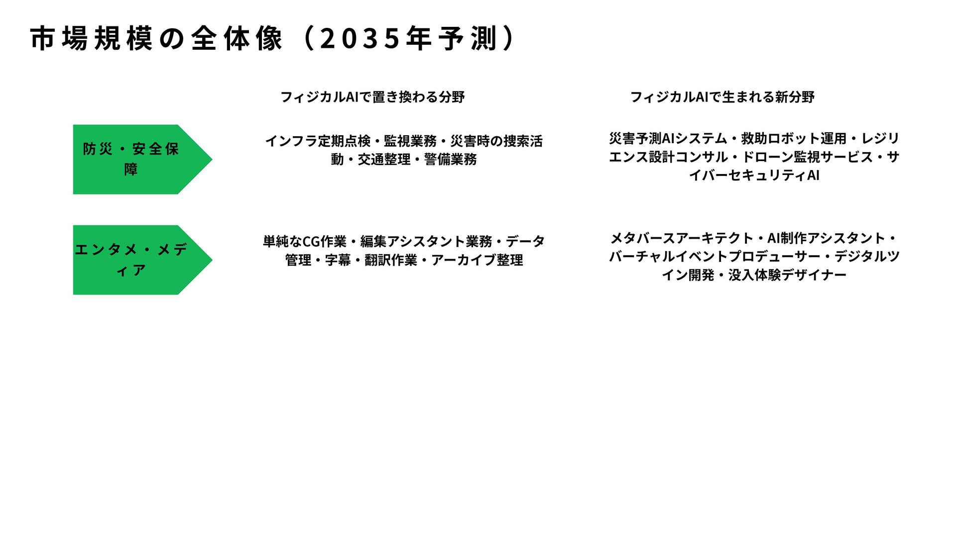 メ ・ メ デ ィ ア インフラ定期点検・監視業務・災害時の捜索活 動・交通整理・警備業務 災害予測AIシステム・救助ロボット運用・レジリ エンス設計コンサル・ドローン監視サービス・サ イバーセキュリティAI 単純なCG作業・編集アシスタント業務・データ 管理・字幕・翻訳作業・アーカイブ整理 メタバースアーキテクト・AI制作アシスタント・ バーチャルイベントプロデューサー・デジタルツ イン開発・没入体験デザイナー 市 場 規 模 の 全 体 像 ( 2 0 3 5 年 予 測 ) フィジカルAIで置き換わる分野 フィジカルAIで生まれる新分野