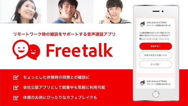 そんな中、チーム内の雑談が減っ たことを気にした上司から「在宅中 に20分以内の雑談ができるスマホ アプリ『Freetalk』を導入しようと思 う!」と提案された。「近所の自販機 に行くまでの休憩でおしゃべりがで きるのか。会社公認なら使ってみよ う!」早速アプリを DLしてみた。 「例のプロジェクトのことでちょっと 話したいかも。緊張するけど誘って みよう」まだ仲を深められていない デザイナーさんに、「休憩がてらお 話しませんか?」と送ってみた。通 話時間は15分に設定。相手から 「参加OK」の返事がきて一安心。 Aさんはアプリおすすめの散歩コー スを歩きながら・デザイナーさんは 自宅から音声通話で、仕事のちょっ とした相談ごとを共有。ちょうど自販 機にあった冬限定のスイーツの話 題からも会話が弾んだ。 「設定時間ぴったりで会話が強制終 了するからスケジューリ ングはしやすいけど、まだ話は途中 なんだよな・・・」 と思ったら!通話後にテキスト チャットができることを発見。 「『さっきはありがとう。これからも気 を使わず話してね!』だって。誘う 時は緊張したけど、話せてよかった ~!」 あの時ちょっとした相談ができたお かげで、プロジェクトのミーティング でも話を進めやすくなった気がして 嬉しい! 『Freetalk』なら気軽に誘えるし、飲 み物やお菓子のおごり機能も使え そう。また使ってみたいな! 2 1 3 4 5 6 会社 公認