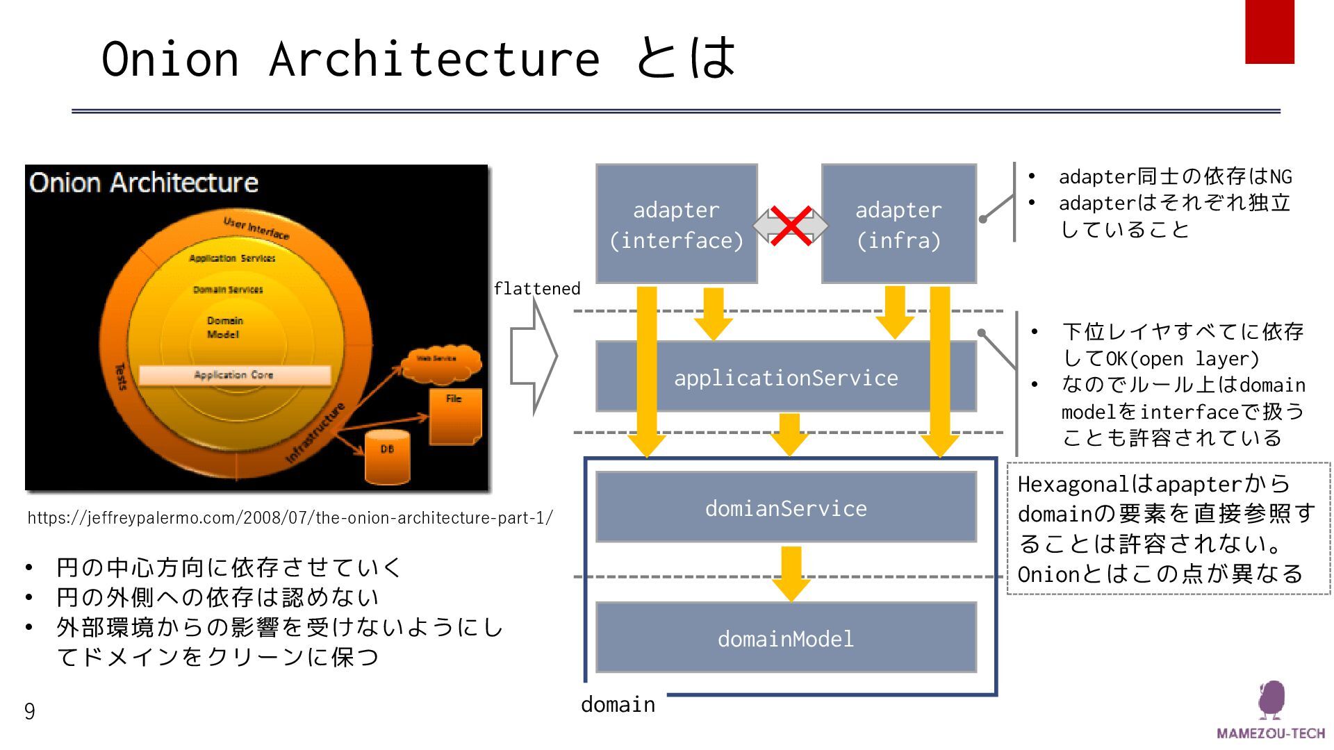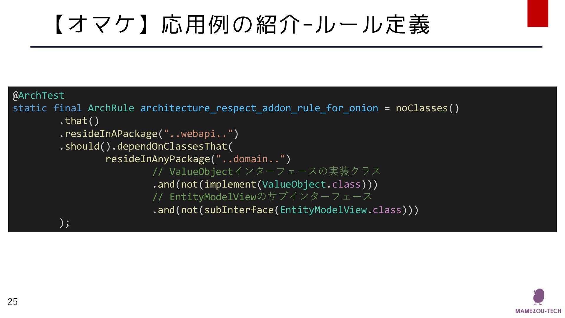 = classes() .that() .resideInAPackage(“..webapi..”) // webapiパッケージ内のクラスは .should().onlyDependOnClassesThat() // 指定されたクラスにのみ依存すべき .resideInAnyPackage( // その指定は次にあげるパッケージのクラス "java..", "lombok..", "org.springframework.web..", // Spring MVCには依存してOK "org.springframework.http..", // Spring MVCには依存してOK "..domain..", "..application..", "..webapi.." // ); webapiパッケージ内でここに示したパッケージ以外のクラスに 対して依存がある場合はエラーとなる <interface(webapi)レイヤの場合>