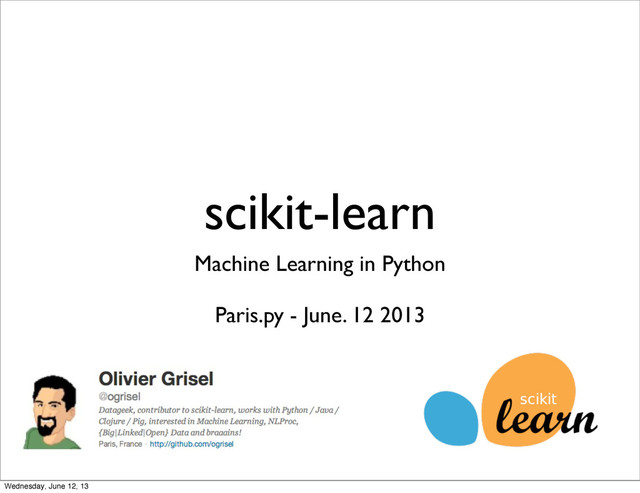200+ questions tagged with [scikit-learn] • Many competitors + benchmarks • 500+ answers on ongoing user survey • 60% academics / 40% from industry • Some data-driven Startups use sklearn Wednesday, June 12, 13