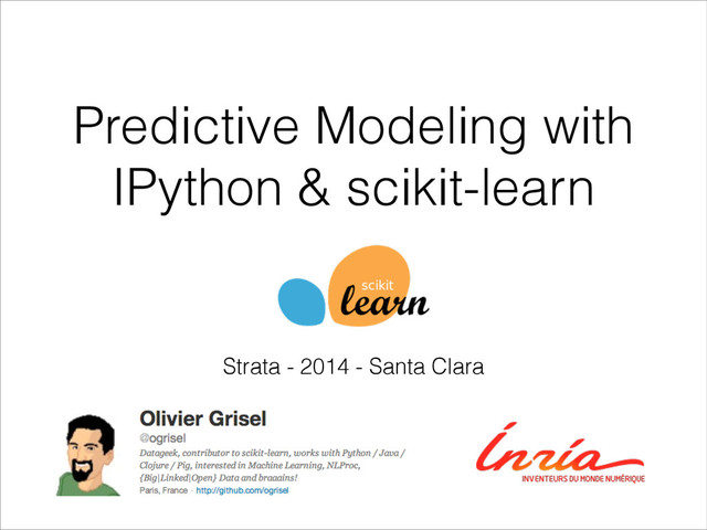 820+ questions tagged with [scikit-learn] • Many competitors + benchmarks • 500+ answers on 0.13 release user survey • 60% academics / 40% from industry • Some data-driven Startups use sklearn