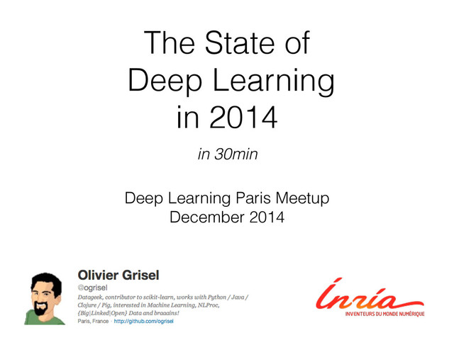at: • Several computer vision tasks • Speech recognition (partially NN-based in 2012, fully in 2013) • Machine Translation (English / French) and Q&A • Multi model tasks: caption generation • Recurrent Neural Network w/ LSTM units seems to be applicable to problems initially thought out of the scope of Machine Learning • Stay tuned for 2015!