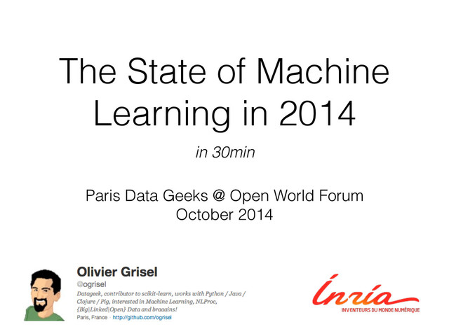 at: • Several computer vision tasks • Speech recognition (partially NN-based in 2012, fully in 2013) • Machine Translation (English / French) • Playing Atari games from the 80’s • Recurrent Neural Network w/ LSTM units seems to be applicable to problems initially thought out of the scope of Machine Learning • Stay tuned for 2015!