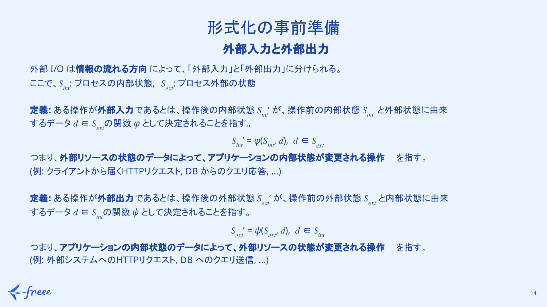 定義: ある操作が外部出力であるとは、操作後の外部状態 𝑆 𝑒𝑥𝑡 ’ が、操作前の外部状態 𝑆 𝑒𝑥𝑡 と内部状態に由来